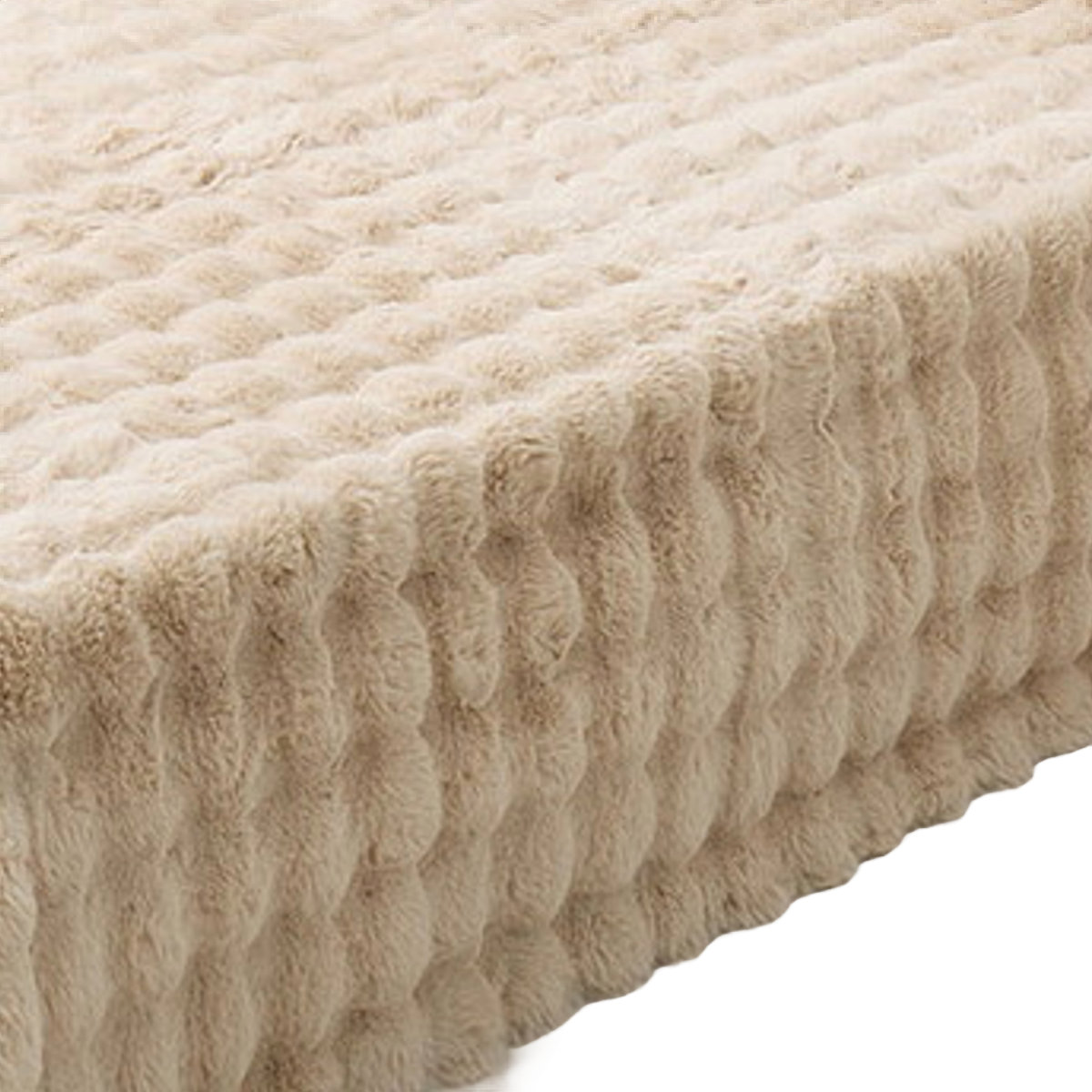 うさぎの毛並みを表現した「ラビットファー調」のブランケットです。きめ細やかでなめらかな触り心地が特徴で、やさしく包み込まれるような、ふわふわのタッチをお楽しみいただけます。ぽこぽことした立体感のある見た目も可愛らしく、インテリアのアクセントにもなります。