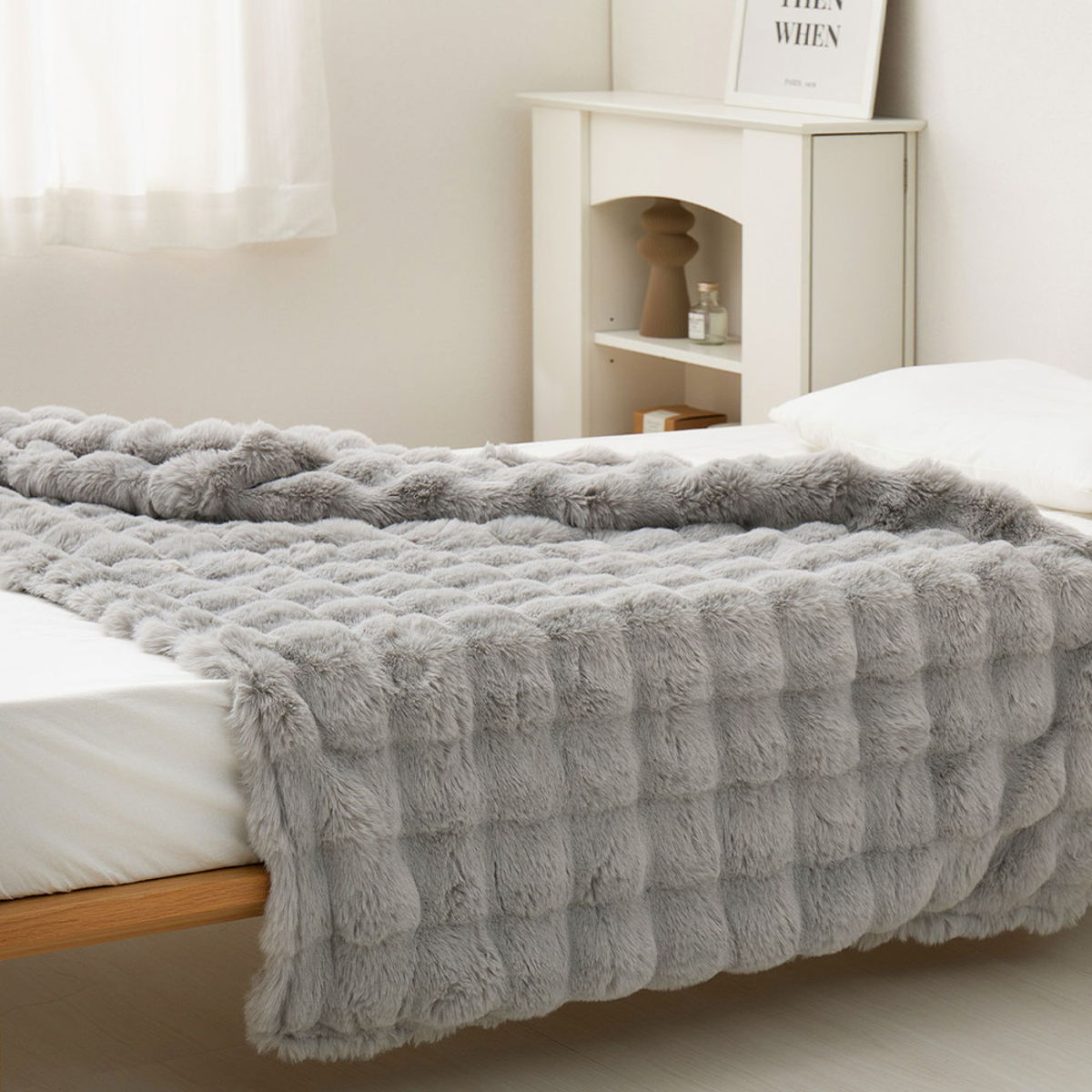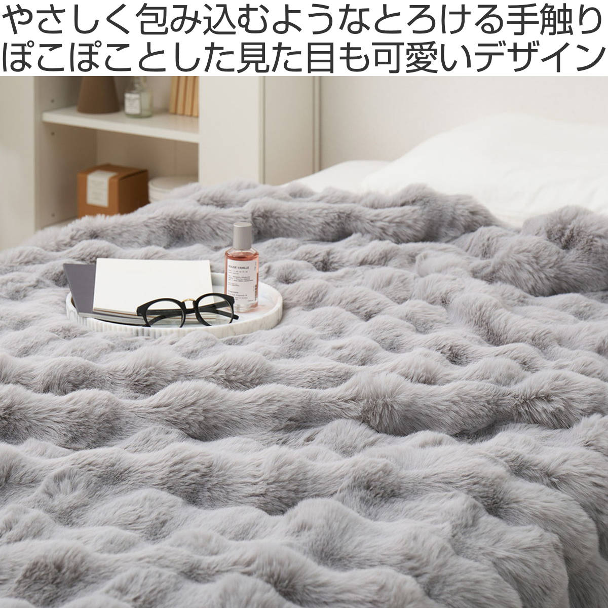 うさぎの毛並みを表現した「ラビットファー調」のブランケットです。きめ細やかでなめらかな触り心地が特徴で、やさしく包み込まれるような、ふわふわのタッチをお楽しみいただけます。ぽこぽことした立体感のある見た目も可愛らしく、インテリアのアクセントにもなります。