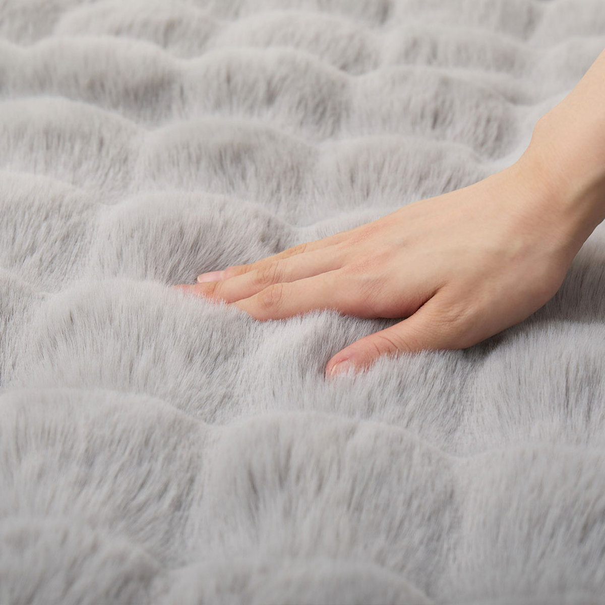 うさぎの毛並みを表現した「ラビットファー調」の毛布です。きめ細やかでなめらかな触り心地が特徴で、やさしく包み込まれるような、ふわふわのタッチをお楽しみいただけます。ぽこぽことした立体感のある見た目も可愛らしく、インテリアのアクセントにもなります。