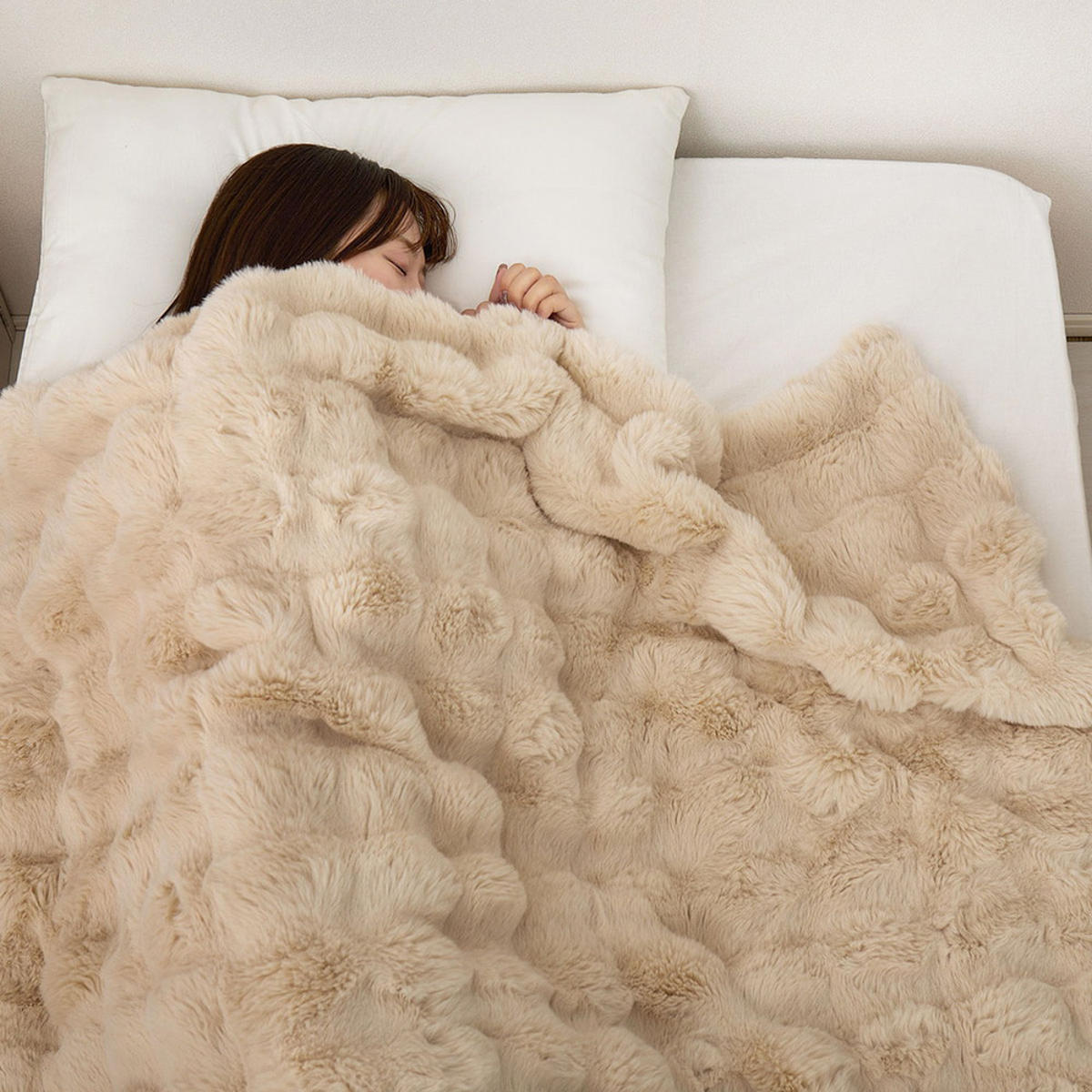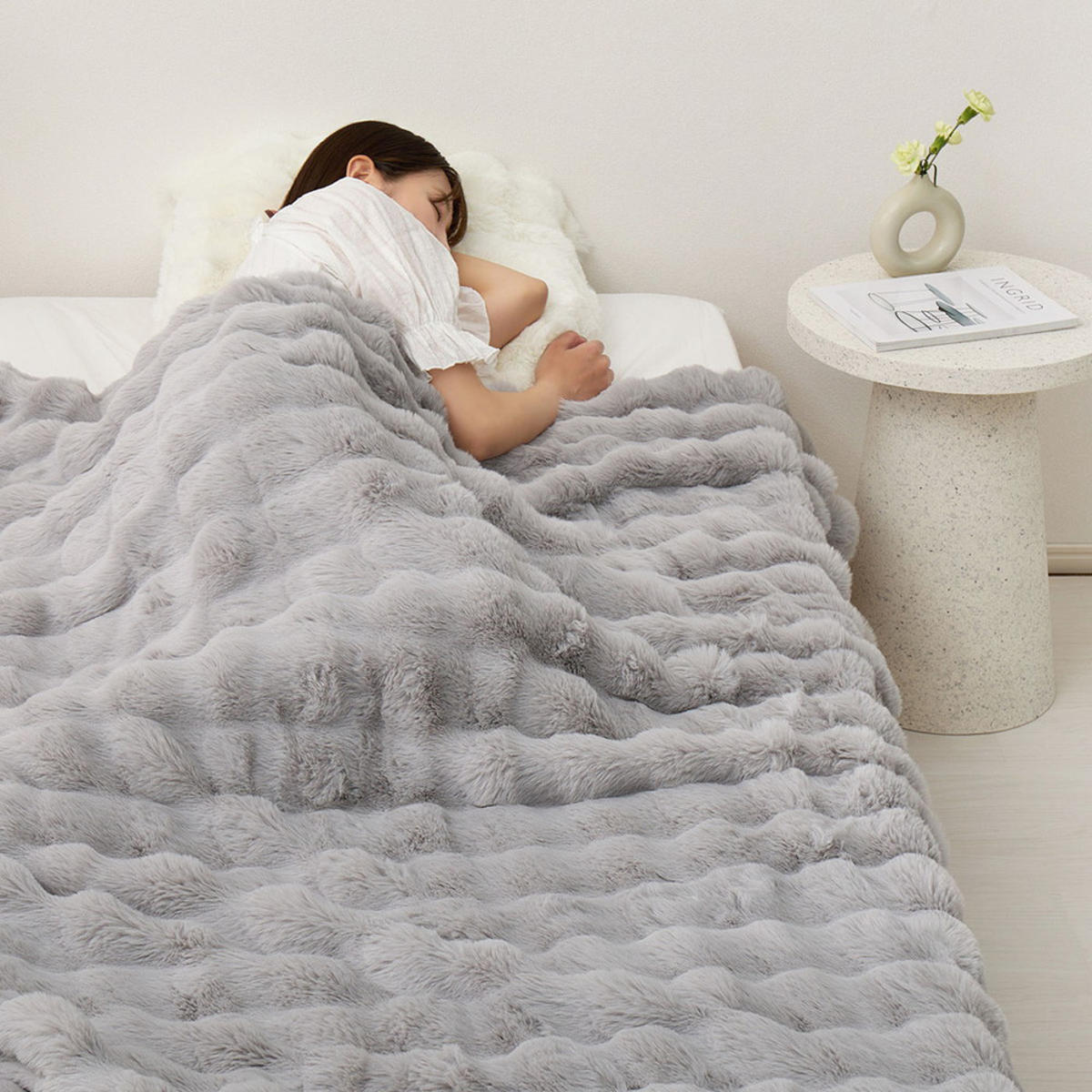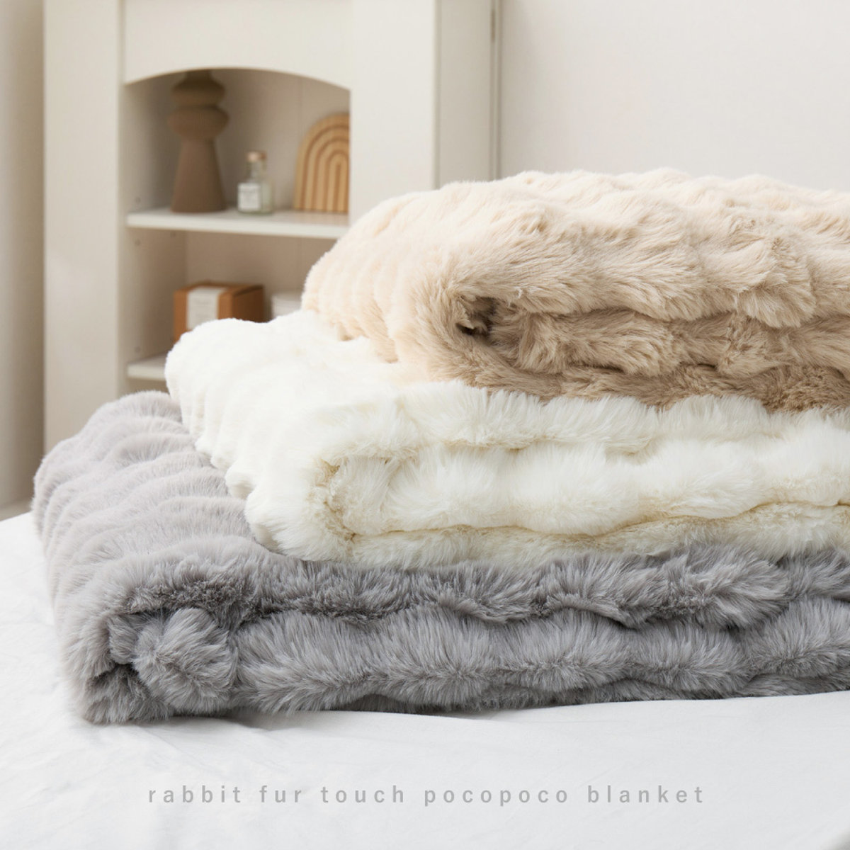 うさぎの毛並みを表現した「ラビットファー調」の毛布です。きめ細やかでなめらかな触り心地が特徴で、やさしく包み込まれるような、ふわふわのタッチをお楽しみいただけます。ぽこぽことした立体感のある見た目も可愛らしく、インテリアのアクセントにもなります。