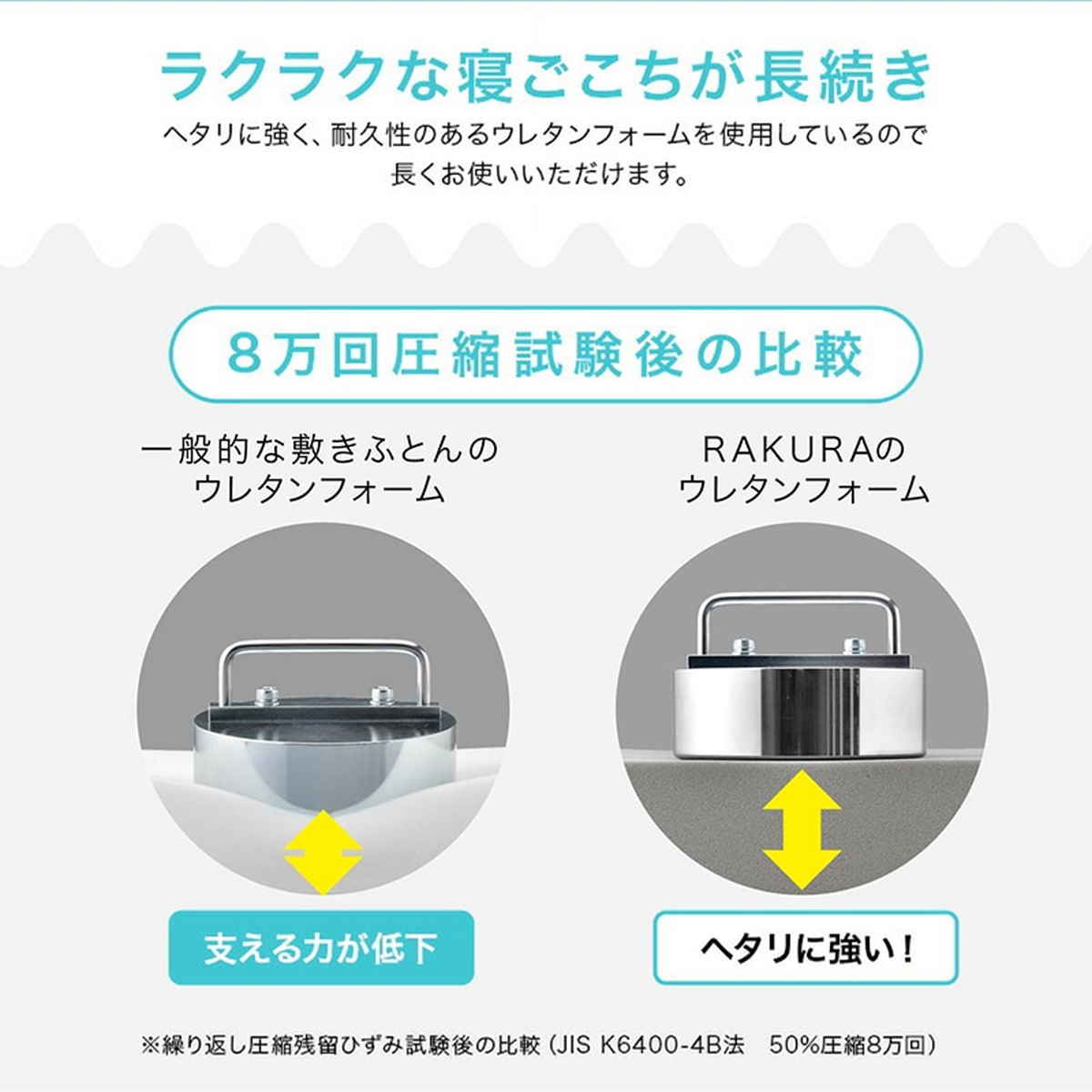 毎日の疲れが気になりはじめる世代に向けた、西川の健康サポートマットレス「RAKURA(ラクラ)」です。ウレタン素材ならではのクッション性と凹凸構造により、幅広い体型の方にフィット。体をしっかり支えながら、ラクな寝心地へと導く健康寝具です。