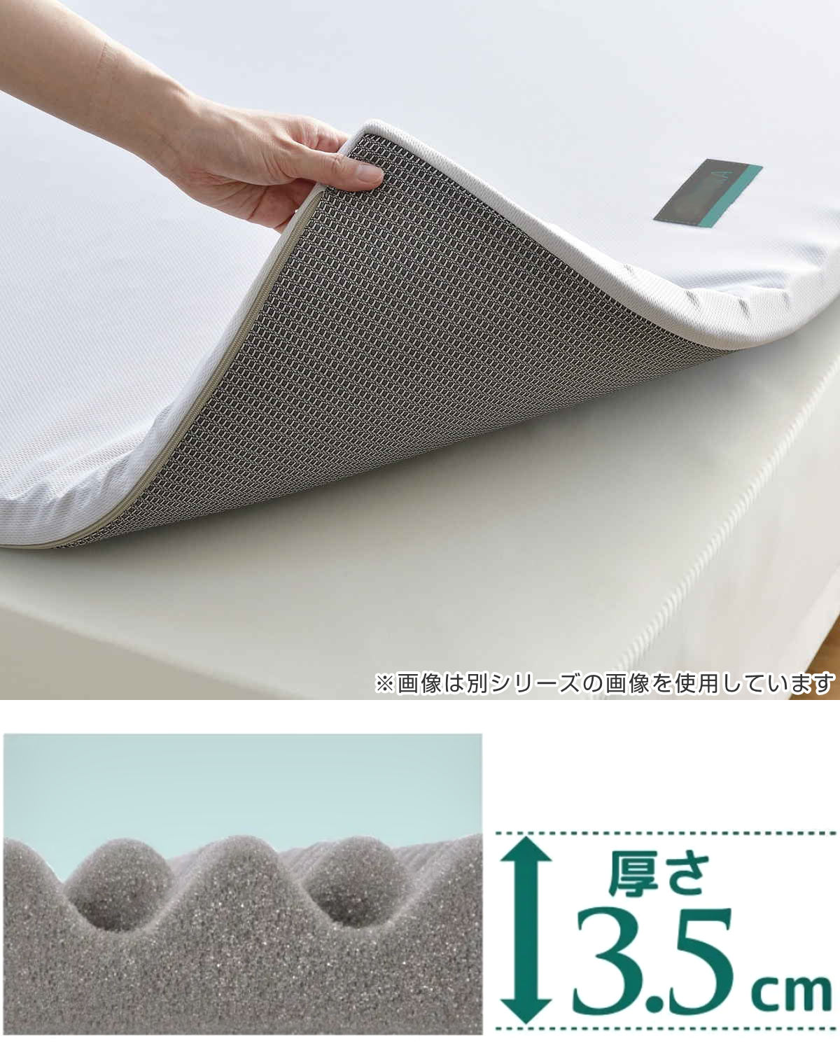 厚さ3.5cmのトッパータイプなので、お使いの寝具に重ねるだけでお使いいただけます。マットレスのへたりや寝心地の悪さの改善が期待できます。
