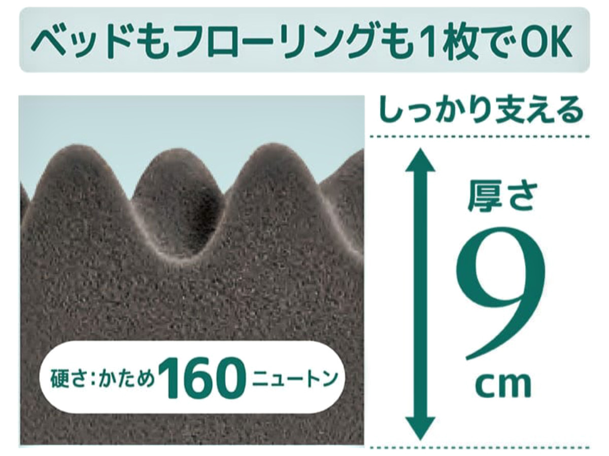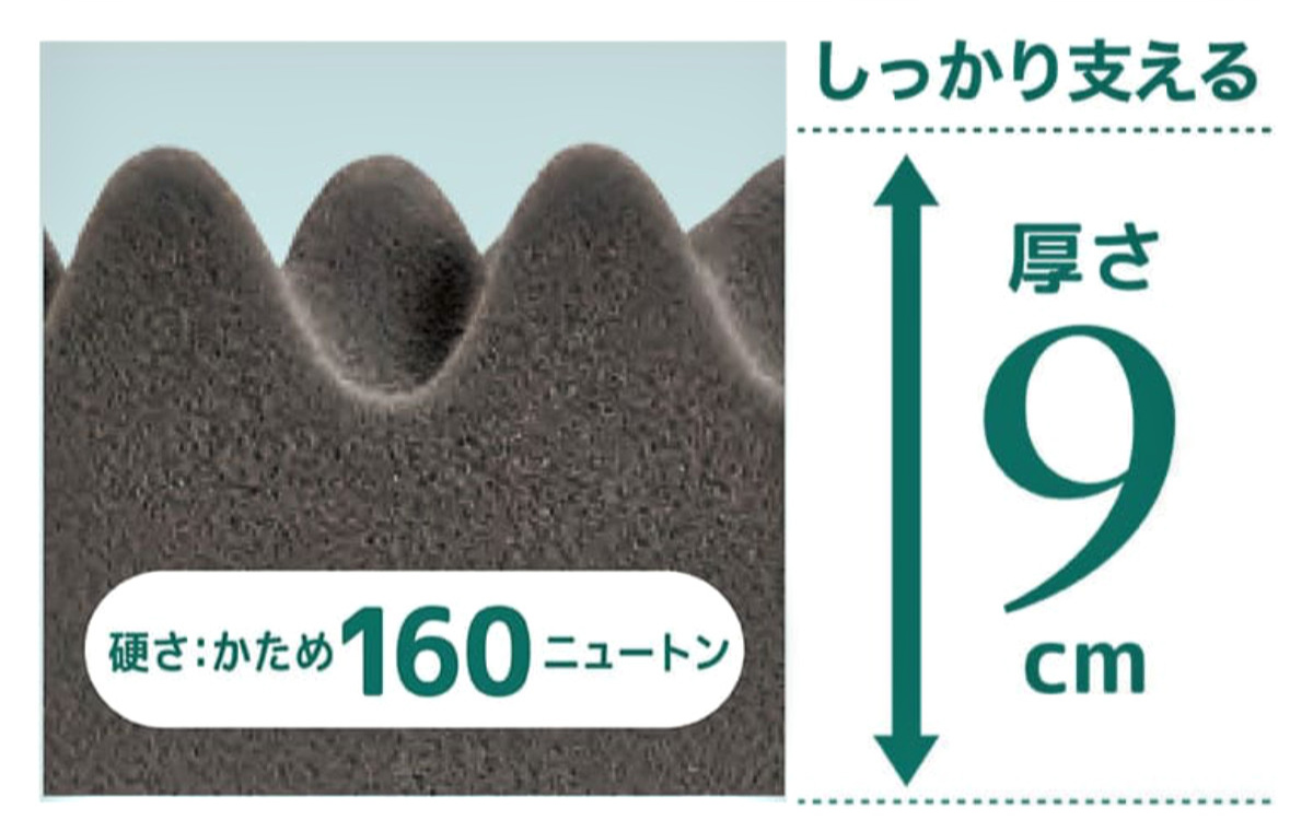 厚さ9cmあるのでしっかり身体を支えます。硬すぎない適度な反発力の160ニュートンです。