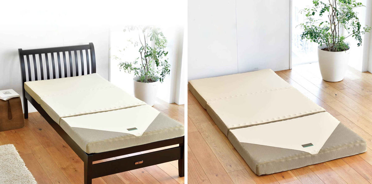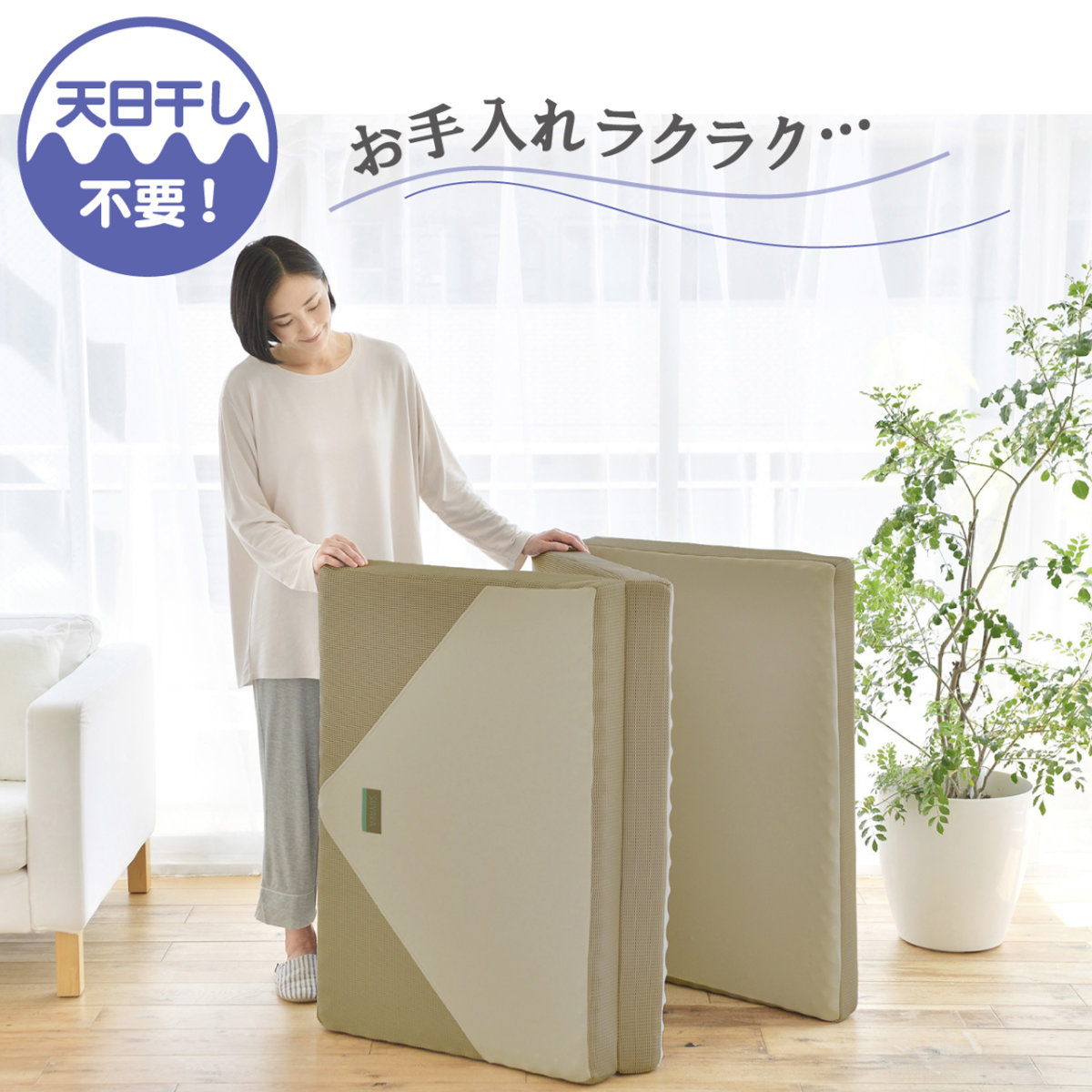 コンパクトに折りたためて、中材を入れ替えることもできる三つ折りタイプです。折りたたむとコンパクトになるので移動もしやすいです。就寝時以外は空間を広く使えるので、お部屋が狭い人や空間を有効活用したい人におすすめです。