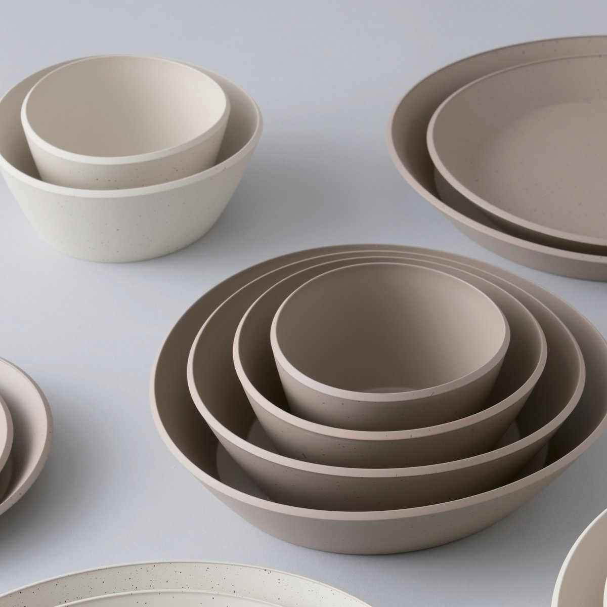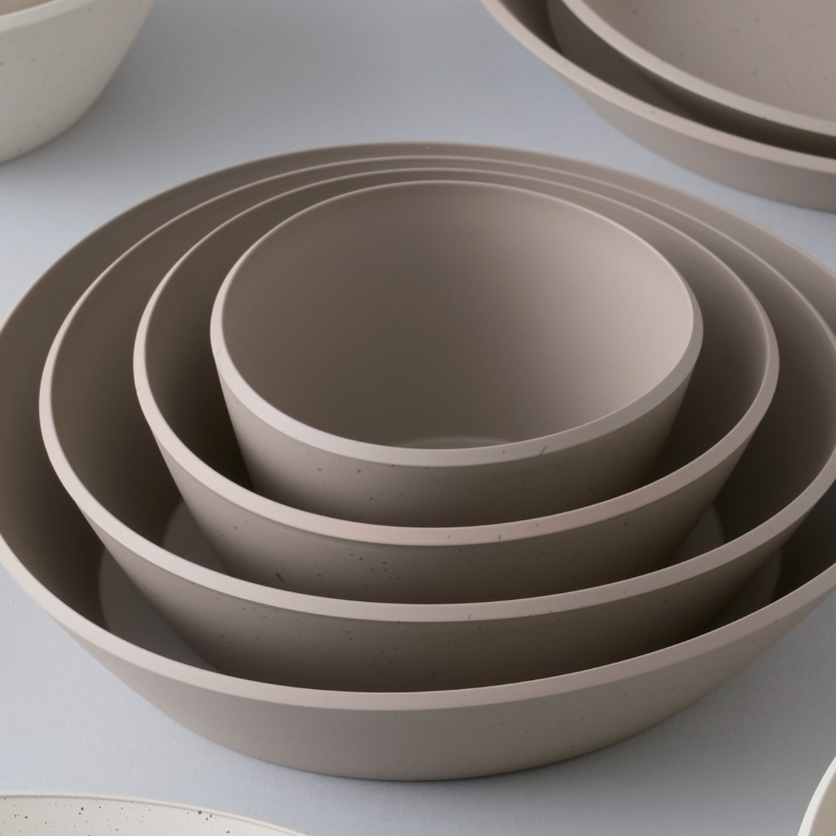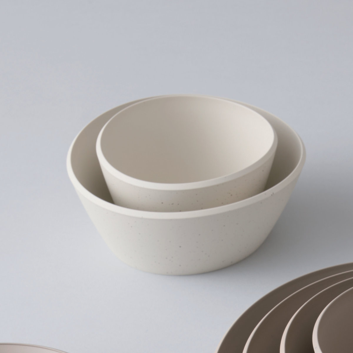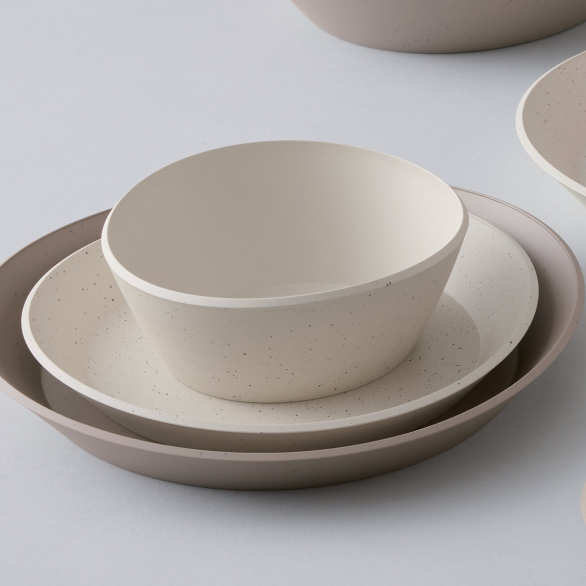 肌触りの良いマットな塗装と、落ち着いた石目模様が特徴の「リップルズ」シリーズです。水の波紋のように美しくコンパクトに重なり、省スペースで収納できます。一人暮らしからファミリーまで、日常使いにもおもてなしにも幅広く活躍するアイテムです。