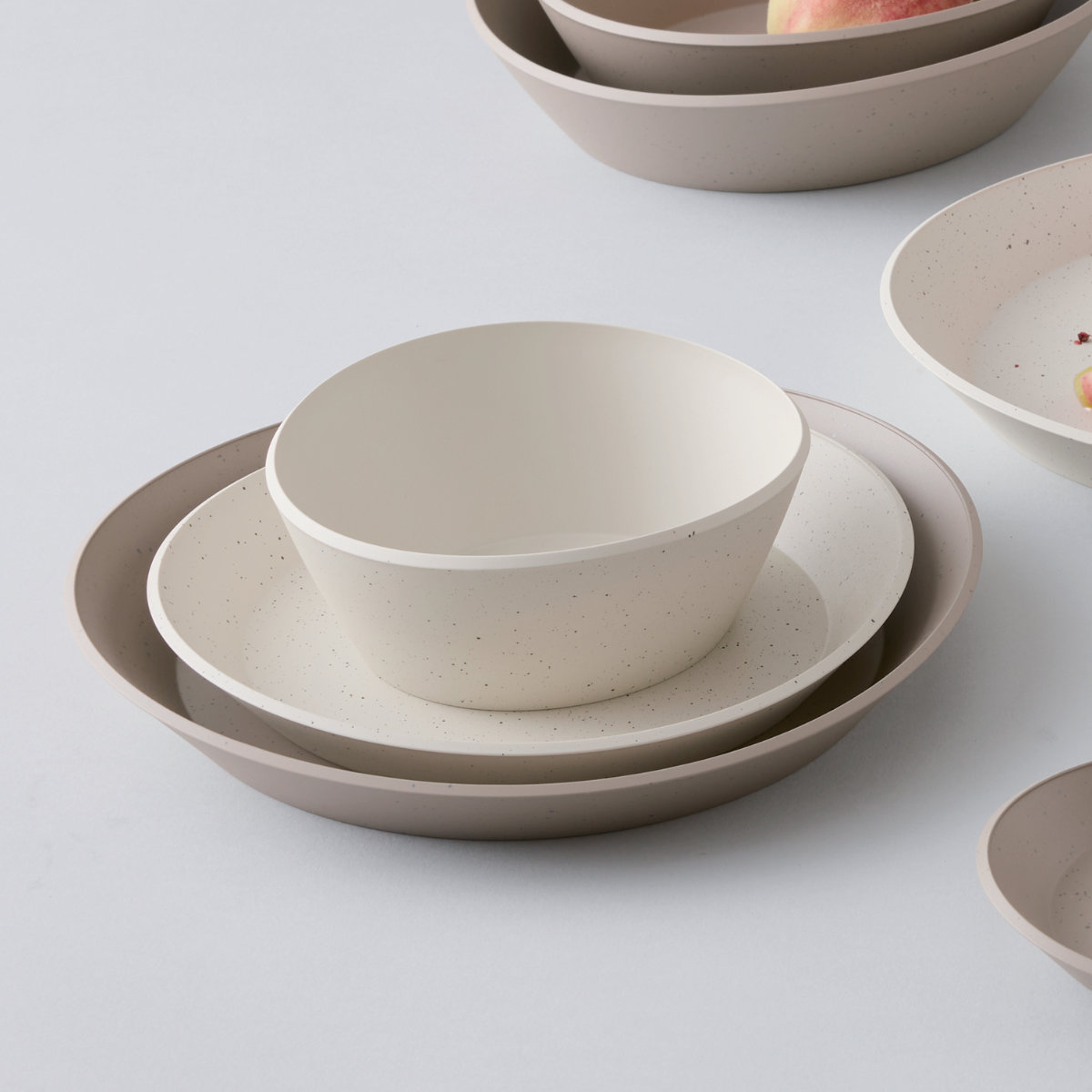肌触りの良いマットな塗装と、落ち着いた石目模様が特徴の「リップルズ」シリーズです。水の波紋のように美しくコンパクトに重なり、省スペースで収納できます。一人暮らしからファミリーまで、日常使いにもおもてなしにも幅広く活躍するアイテムです。