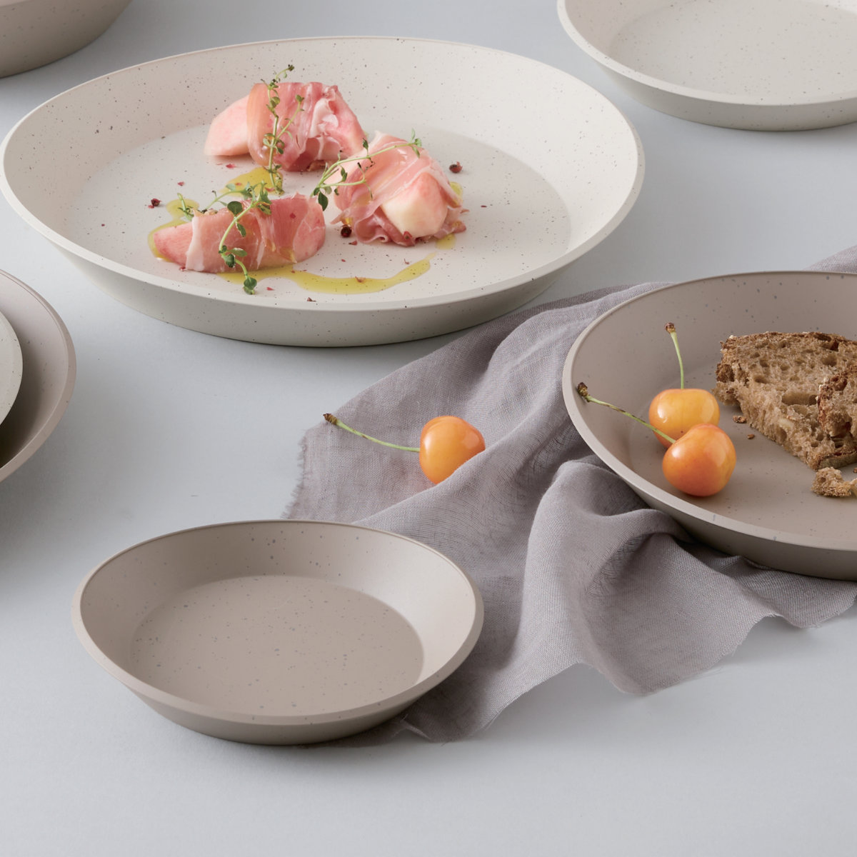 肌触りの良いマットな塗装と、落ち着いた石目模様が特徴の「リップルズ」シリーズです。水の波紋のように美しくコンパクトに重なり、省スペースで収納できます。一人暮らしからファミリーまで、日常使いにもおもてなしにも幅広く活躍するアイテムです。