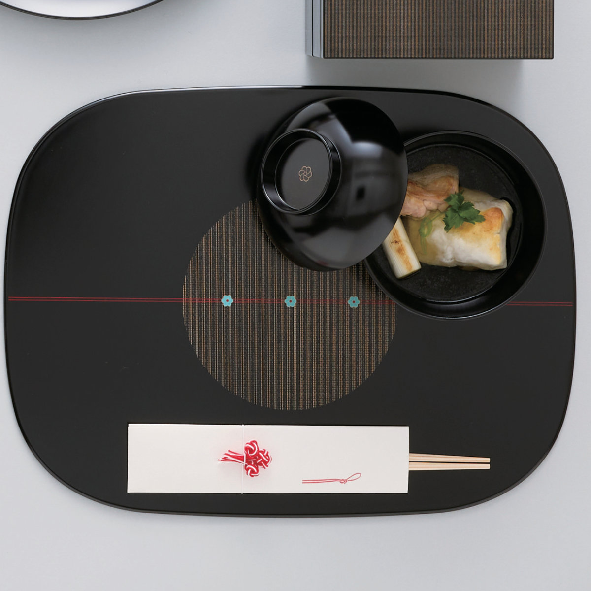 ランチョンマット むすび 13.0寸 くつわランチョマット ノンスリップ ( ランチトレイ お膳 長方形 プラスチック 樹脂 日本製 和食 和食器 和風 和モダン おしゃれ シンプル お祝い ) 【黒】