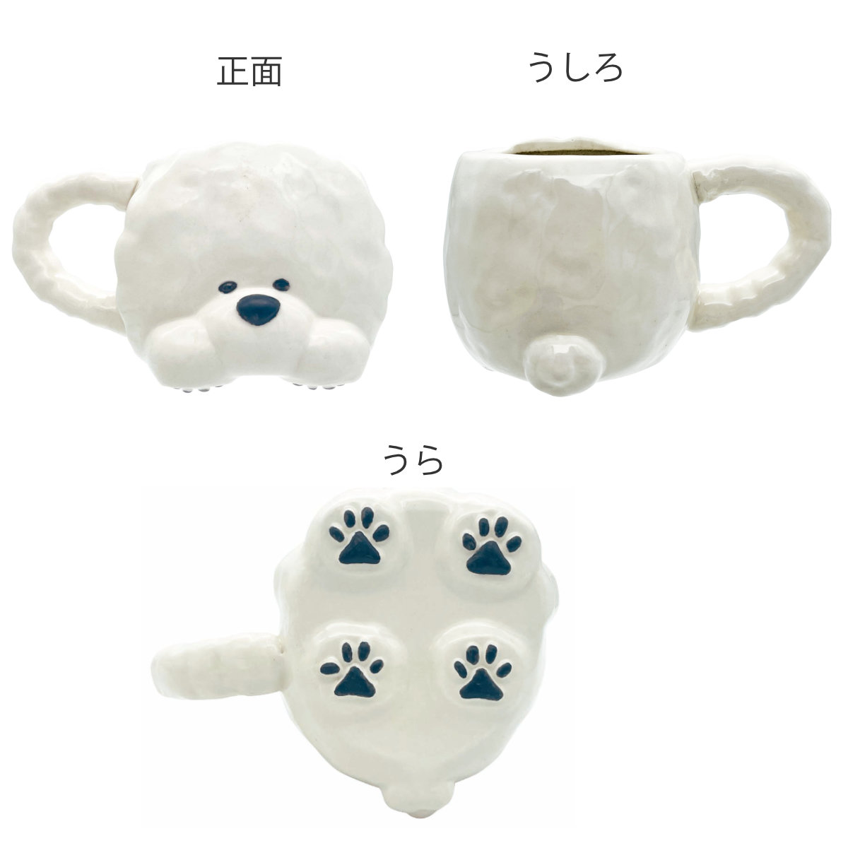 底面にあしらわれたビションフリーゼの足裏デザインは、見ているだけでほっこりします。毎日のティータイムをより楽しいひとときにしてくれます。
