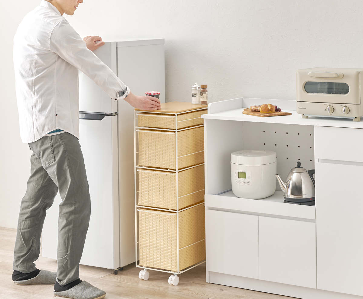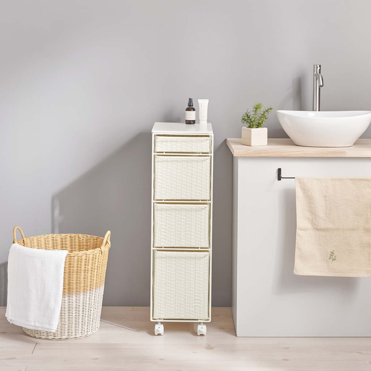 お手入れのしやすい樹脂製なので、水周りでも便利にお使いいただけます。通気性の良いラタン調のデザインで、衣類やタオルの収納にもおすすめです。