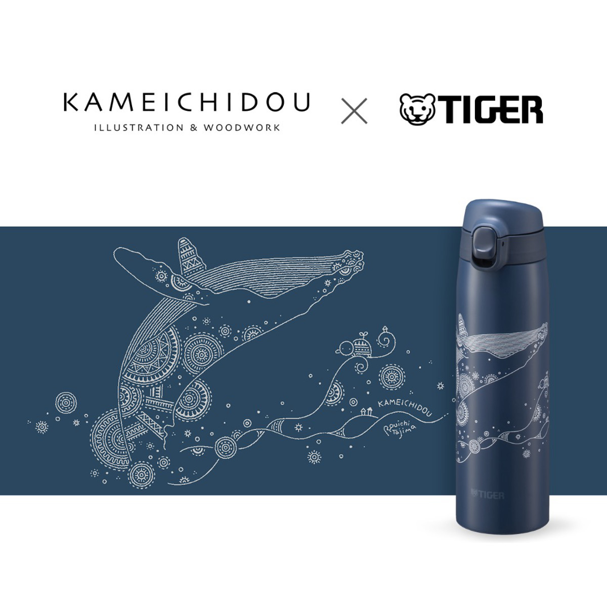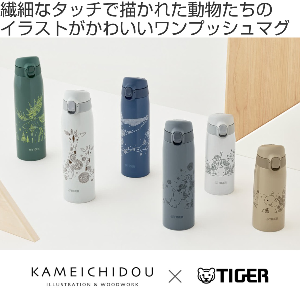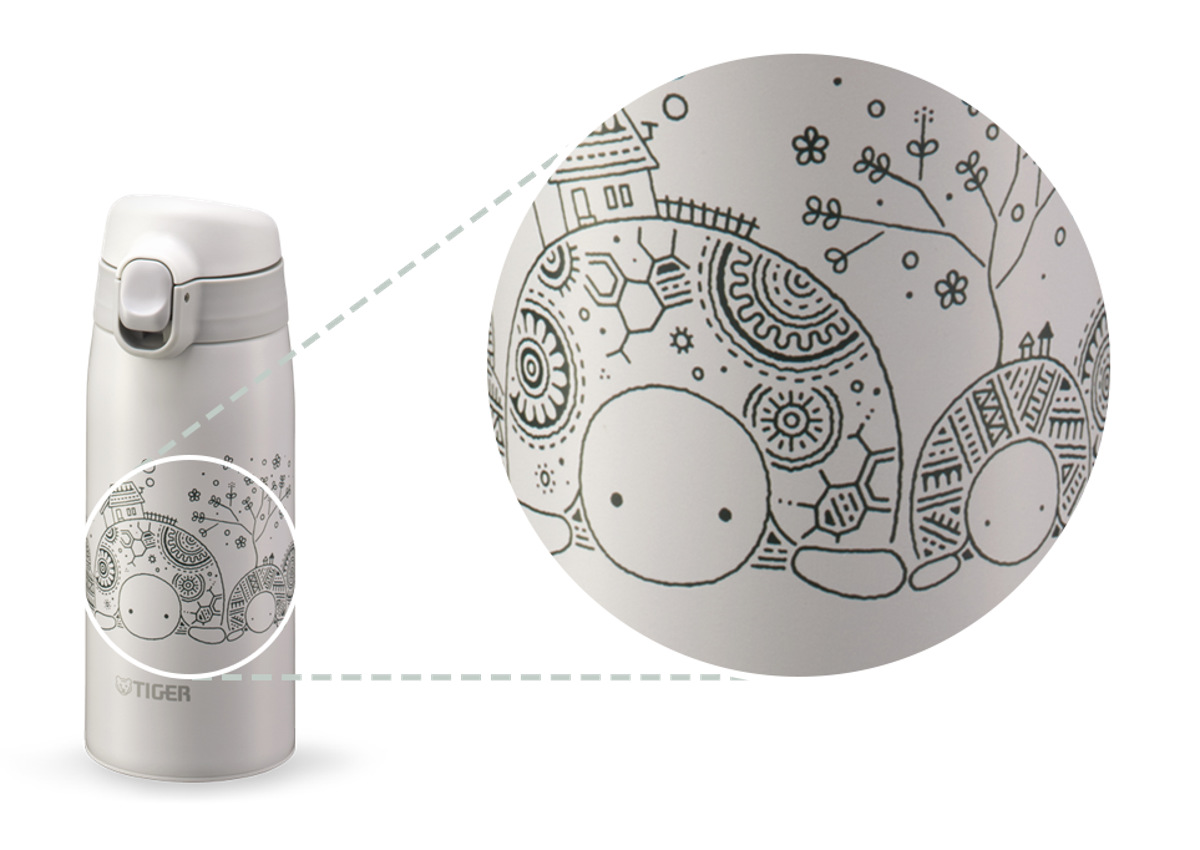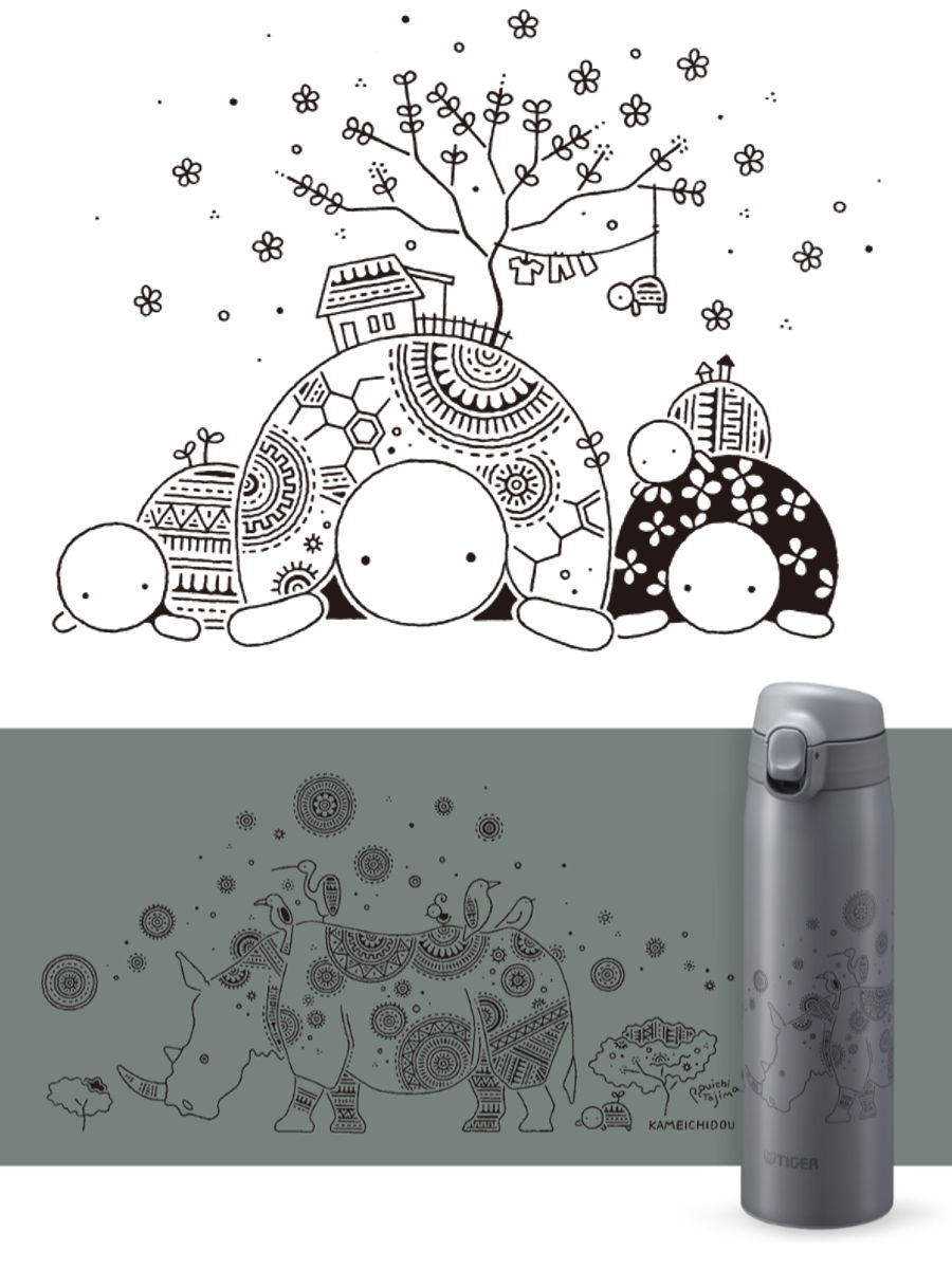 「かめいち堂」は、かめをはじめとした様々な動物を描く作品で人気のイラストレーターです。メインの動物の周りには、ほのぼのと温かくも、細かい模様や草花が水筒本体に描き込まれています。かめいち堂のオリジナルデザインがお楽しみいただけます。