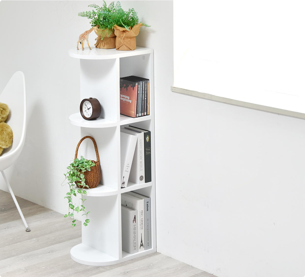 棚板は左右どちらにも取り付けが可能です。お部屋のレイアウトや動線に合わせて、光の入り方や壁紙の見え方を自由にアレンジできます。模様替えの際も、組み替えるだけで手軽に雰囲気を変えられます。