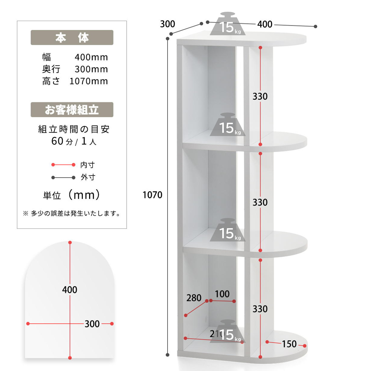 | 耐荷重 | 1段あたり:15kg 全体:45kg |
