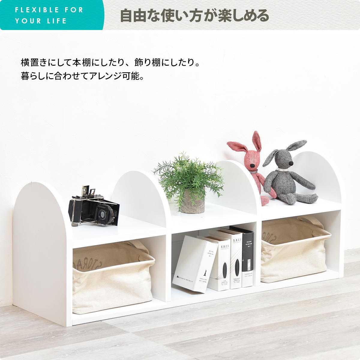 縦に使って棚として使うはもちろん、横置きでデスクの上に置いて小物収納にも便利なラックとしてお使いいただけます。