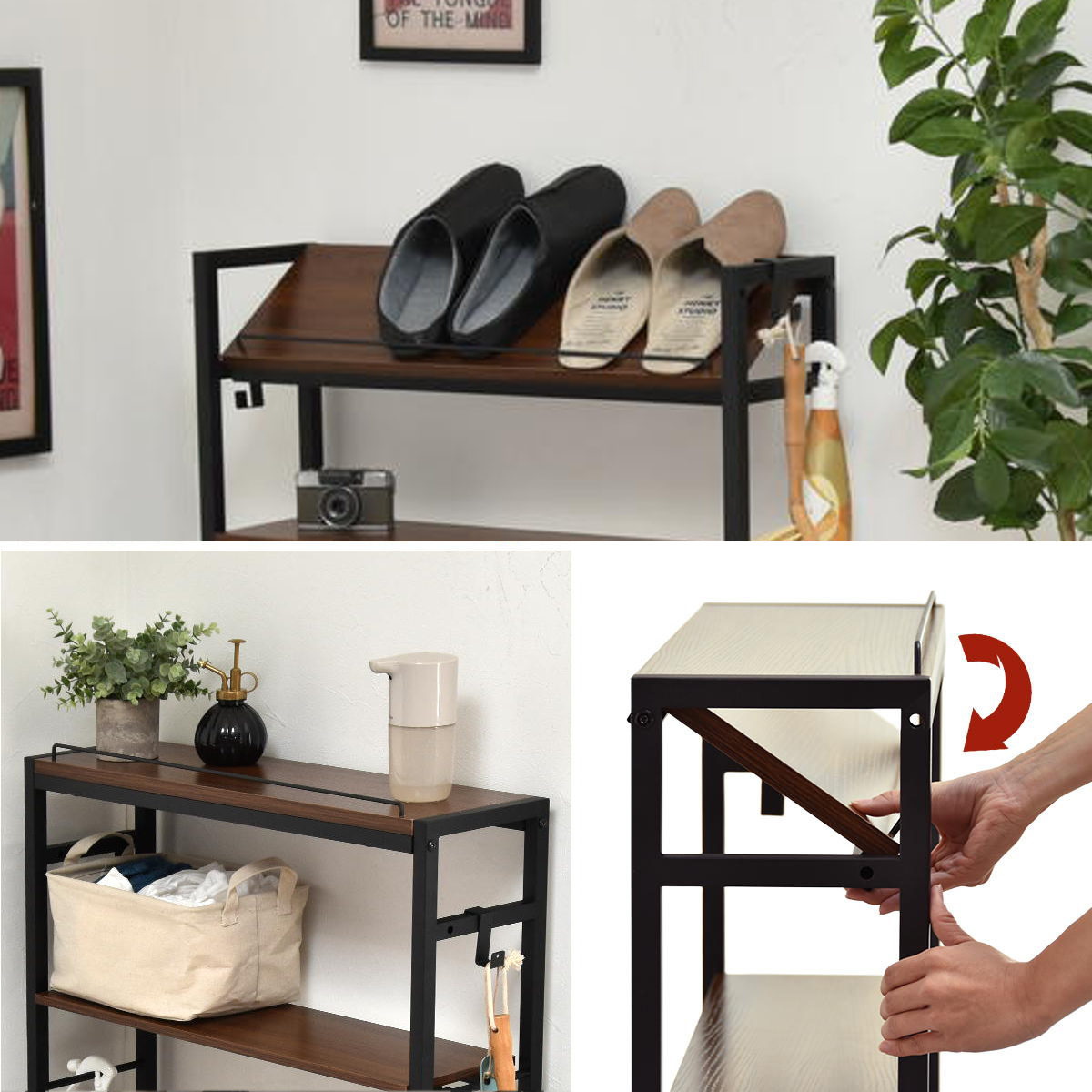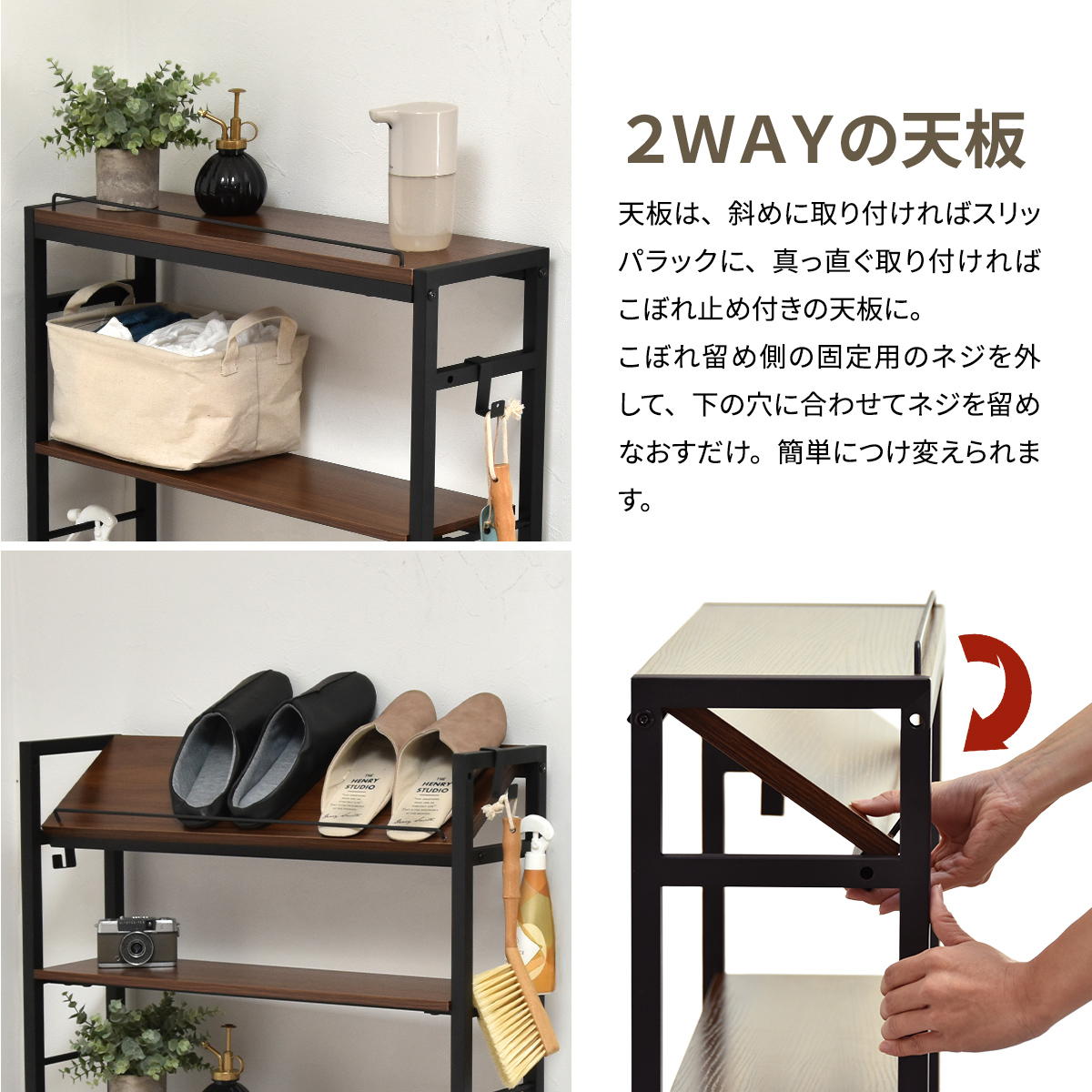 天板は斜めに取り付けることでスリッパラックとして使用できます。こぼれ留め側の固定ネジを外し、下の穴に付け替えるだけなので、使い方に合わせて簡単にアレンジできます。