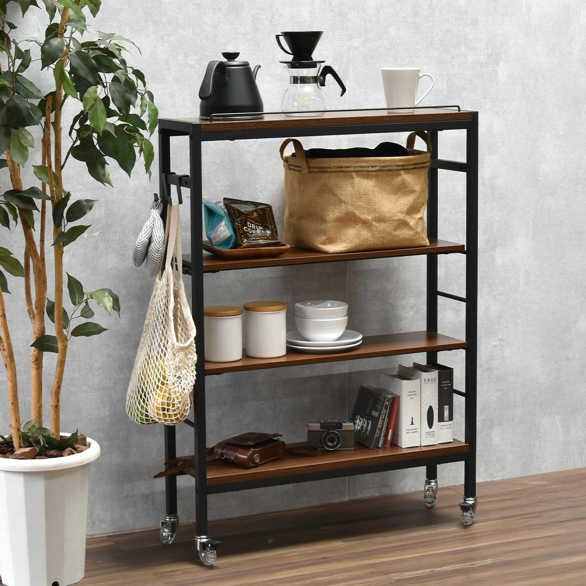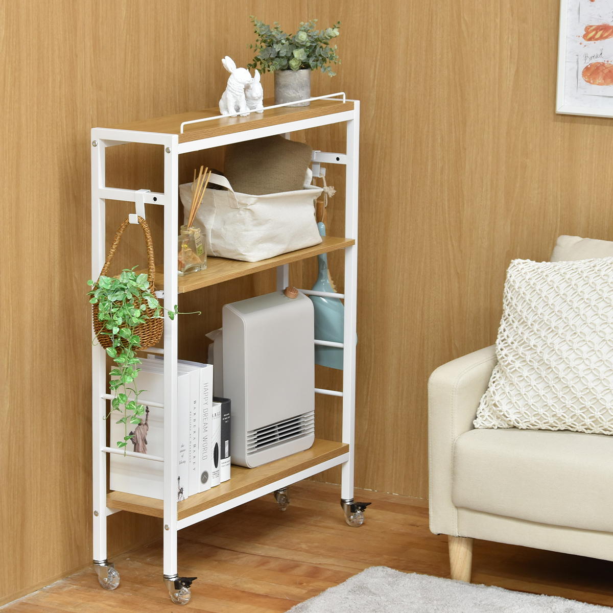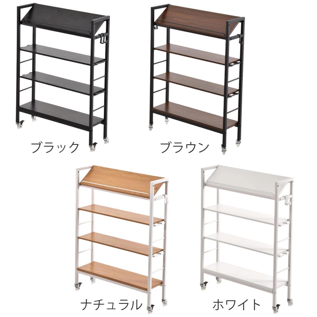 オープンラック 幅79cm キャスター付き 可動棚 木目調 スリム ( ラック 棚 本棚 スリッパラック フック付き 2way シェルフ 飾り棚 玄関 四段 奥行スリム スリッパ収納 ) 【ナチュラル】