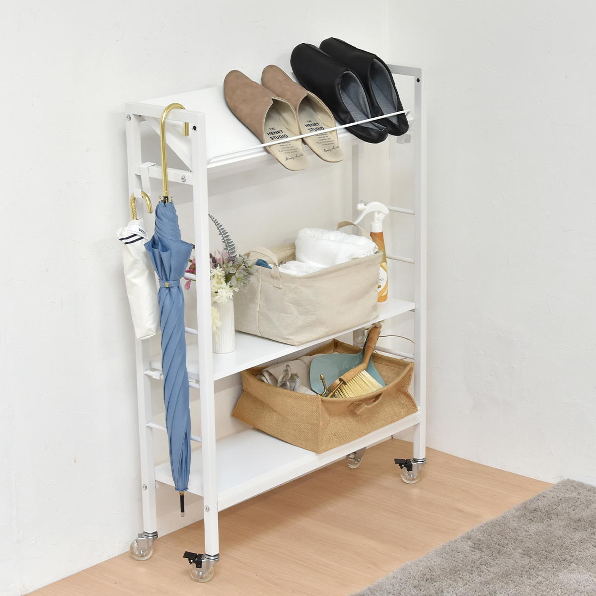 場所を取らずに置ける、スリム設計の収納ラックです。幅を抑えたサイズ感で、リビングや玄関の空いたスペースにも無理なく収まります。