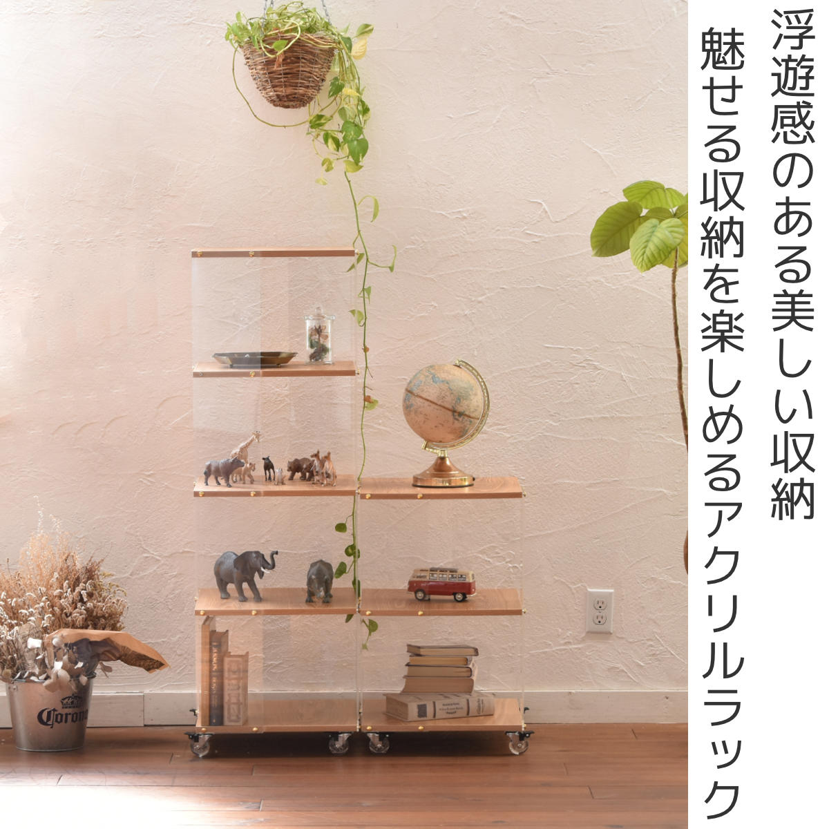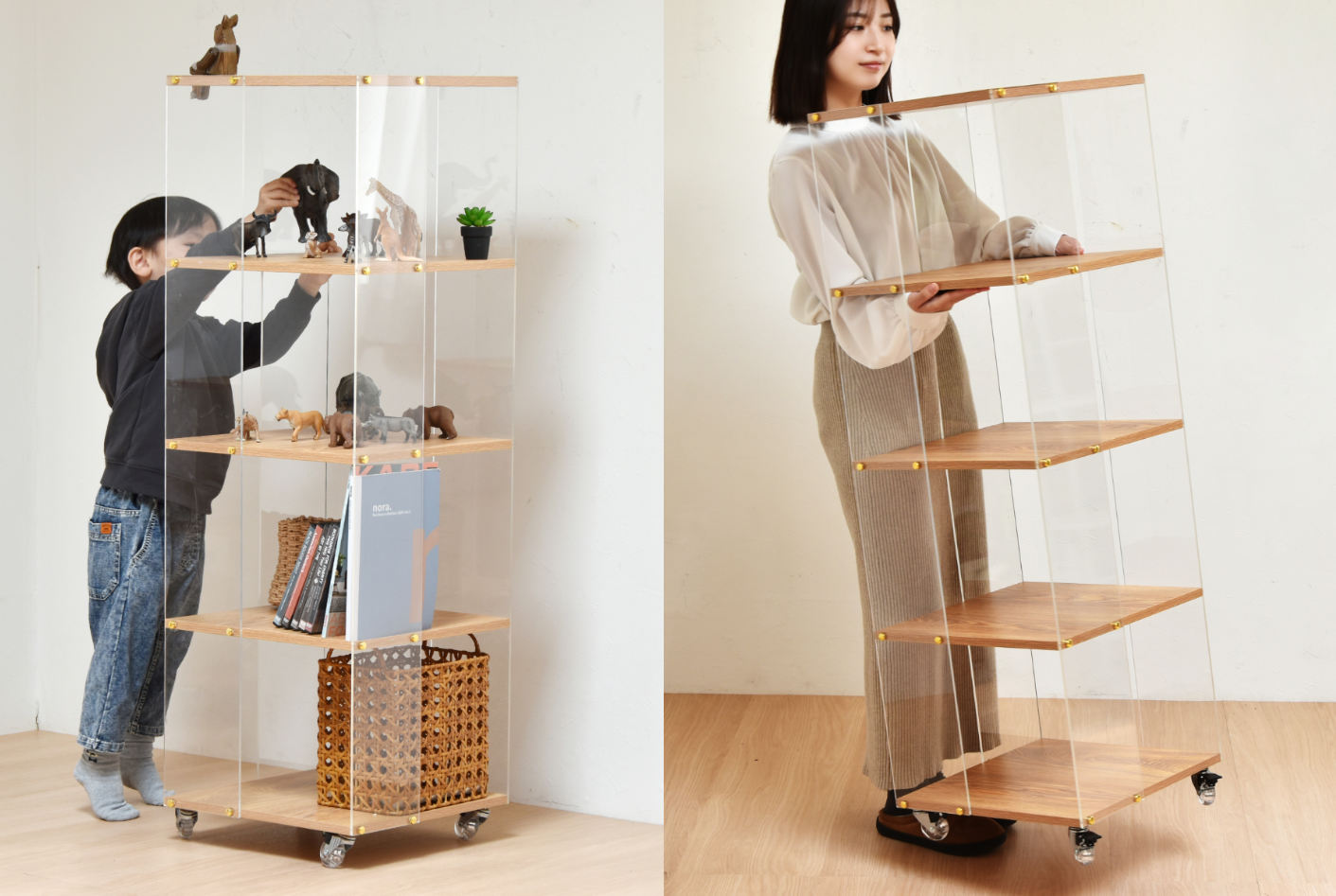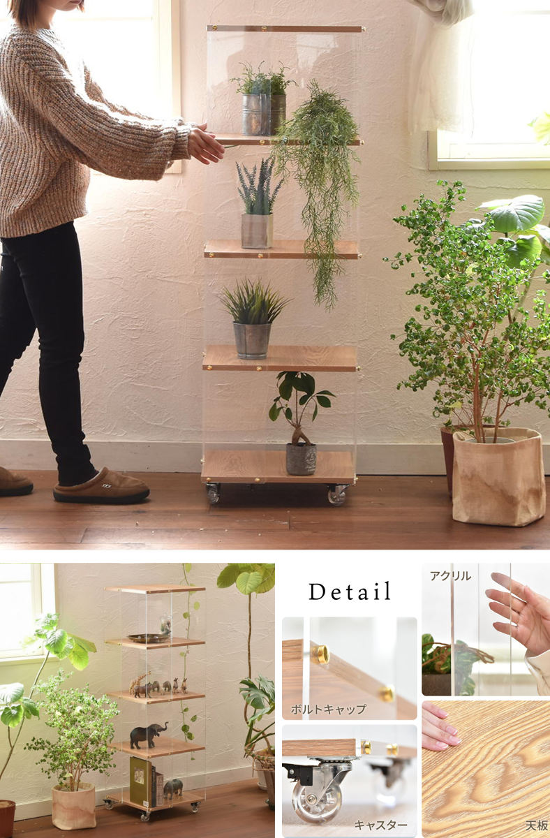 アクリルラック 幅45.5cm 5段 キャスター付き 木目調 ディスプレイラック ( ラック オープンラック 棚 ディスプレイ アクリル製 シェルフ 飾り棚 五段 クリア 透明 浮遊感 割れにくい 軽量 花台 ソファサイド )