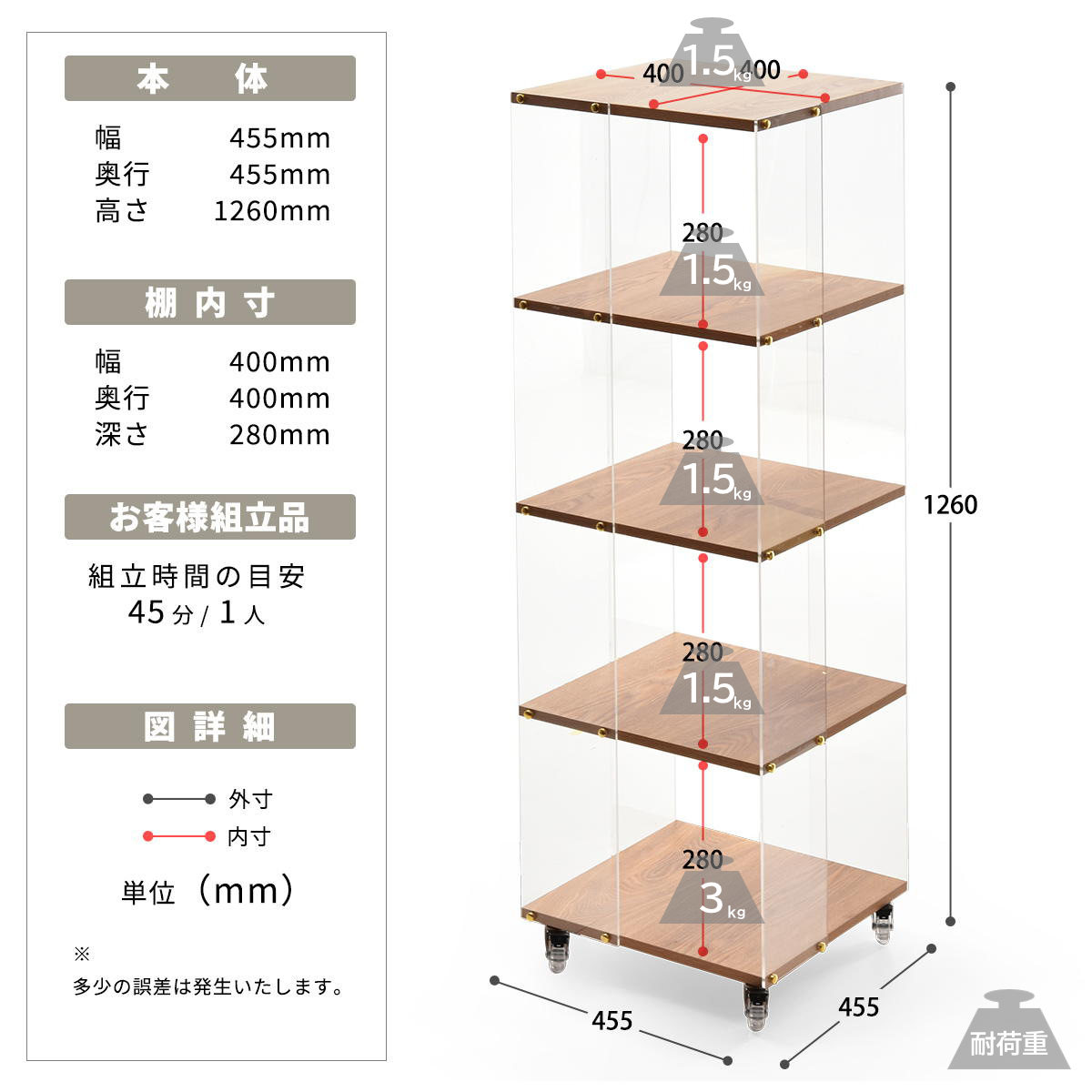 | 耐荷重 | 底板:3kg 棚板・天板1段あたり:1.5kg 全体:9kg |