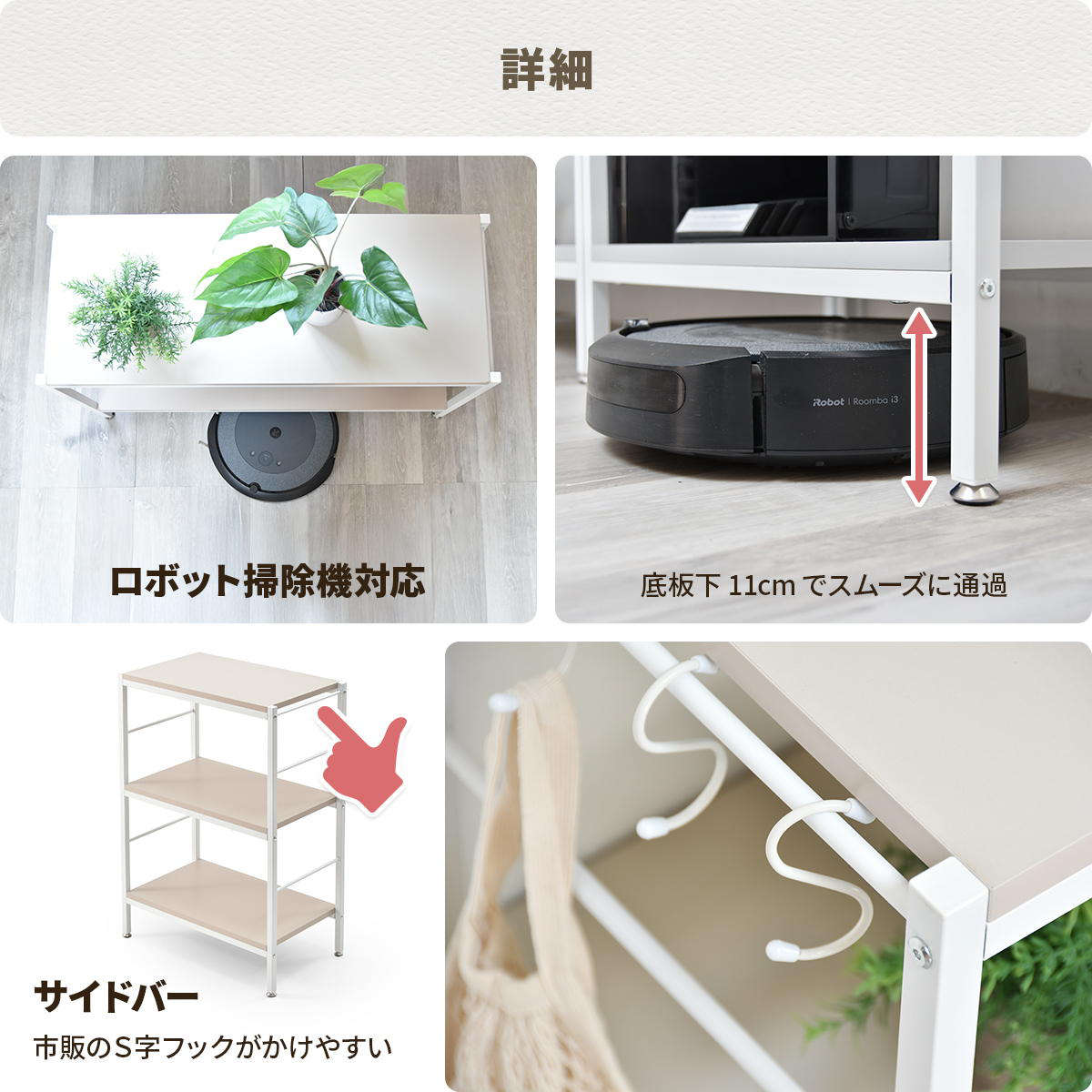 お掃除ロボットが通れる高めの脚部で、ホコリが溜まりやすいラック下をいつでも清潔に保つことができます。
