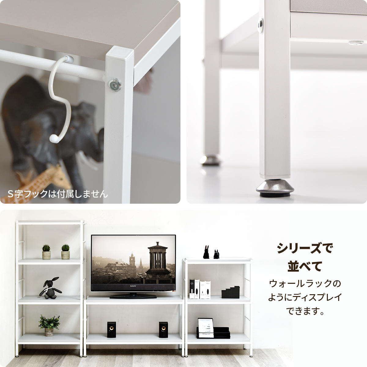 フレームのサイドバーはS字フックを引っ掛けやすい仕様。お手持ちのS字フックを使って掛ける収納も◎