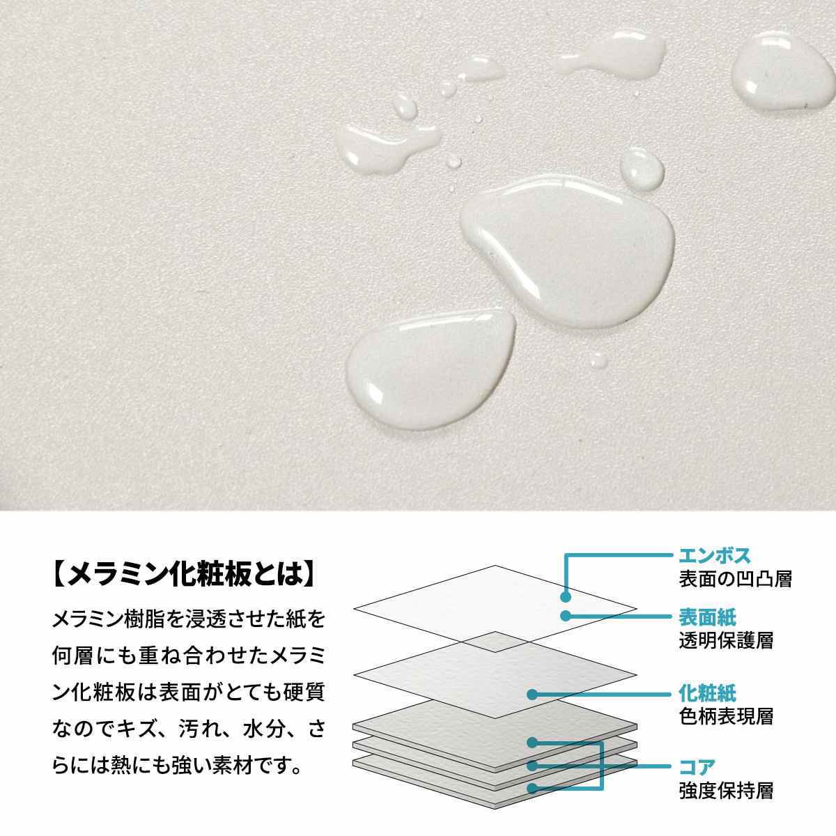 天板と棚板は、お手入れのしやすいメラミン化粧板を使用しています。万が一汚れてしまっても、サッと水拭きすることができるので、毎日気軽にお使いいただけます。