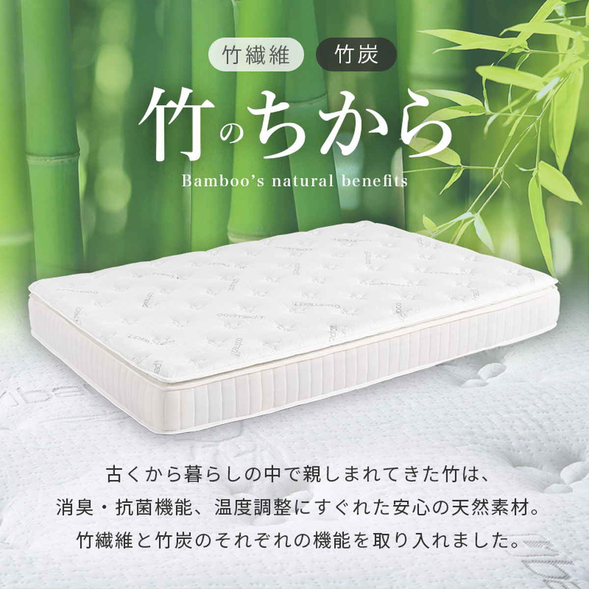 消臭・抗菌機能、温度調整にすぐれた、安心の天然素材である竹繊維と、竹炭のそれぞれの機能を取り入れたマットレスです。
