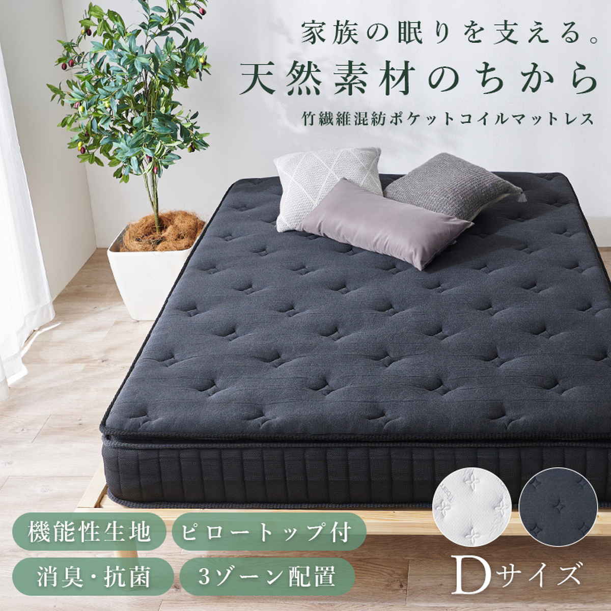| 材質 | 主材:ポケットコイル 張地:70%ポリエステル/30%竹・竹炭繊維 |