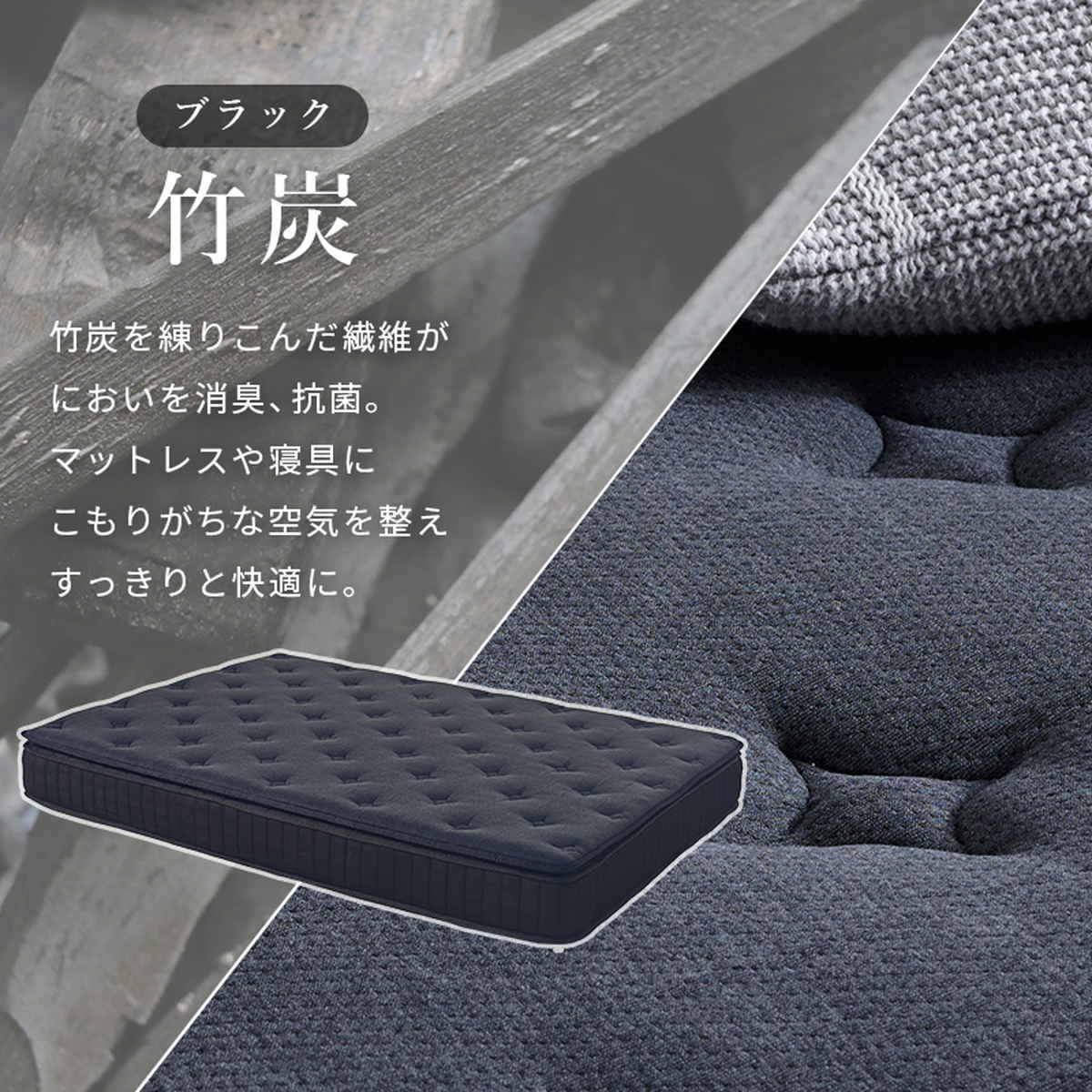 竹炭を練りこんだ繊維がニオイを消臭、抗菌。マットレスや寝具にこもりがちな空気を整え、すっきりと快適にします。