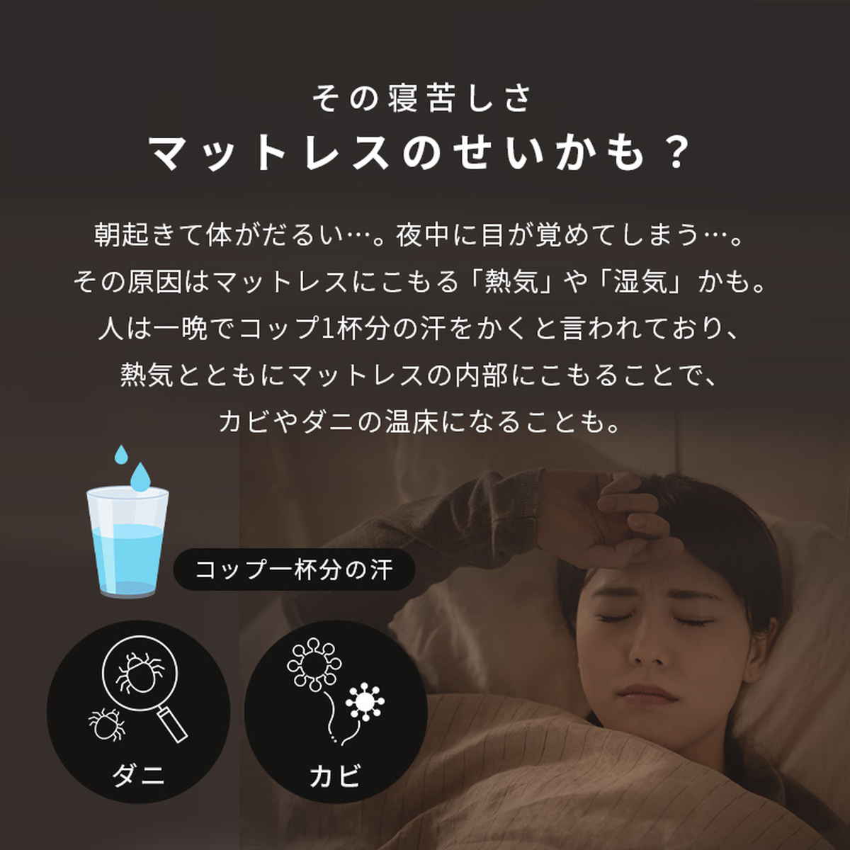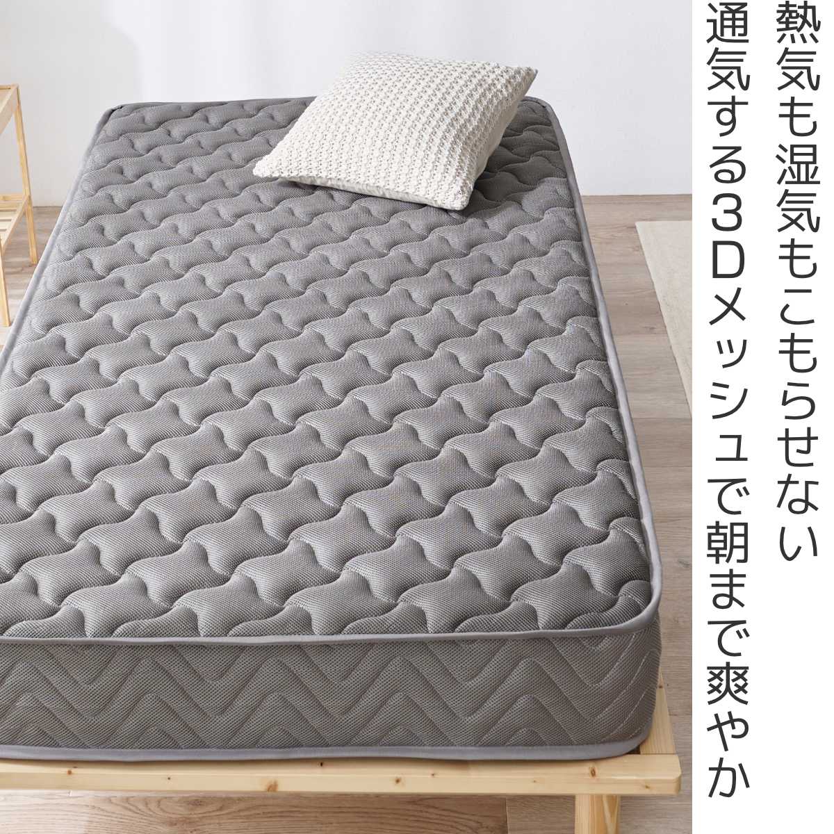表面・裏面・側面すべてに通気性の良い3Dメッシュ生地で仕上げました。寝返りを打つたびに空気が入れ替わり、こもりがちな熱気や寝汗による湿気をスムーズに放出します。ムレやベタつきを感じにくく、清潔で快適な寝環境をキープできます。