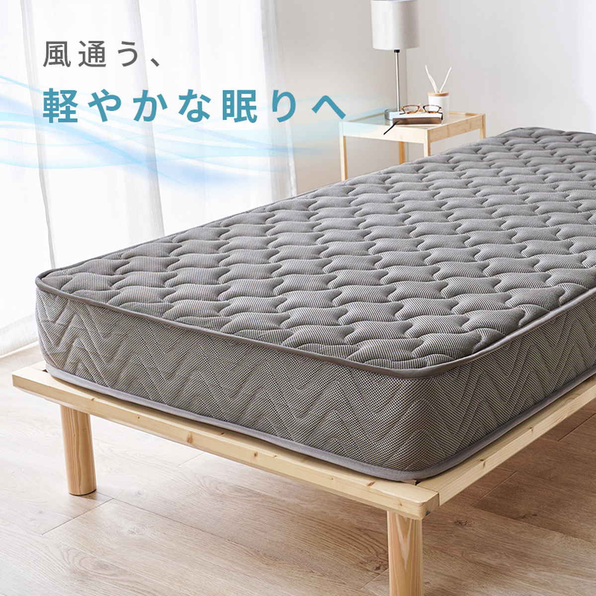 コイルは空気が通りやすい「並行配列」を採用し、内部の通気性をさらに向上させています。反発力・耐久性・強度に優れた高品質コイルを使用しており、長期間使ってもヘタリにくく、安定した寝心地が続きます。