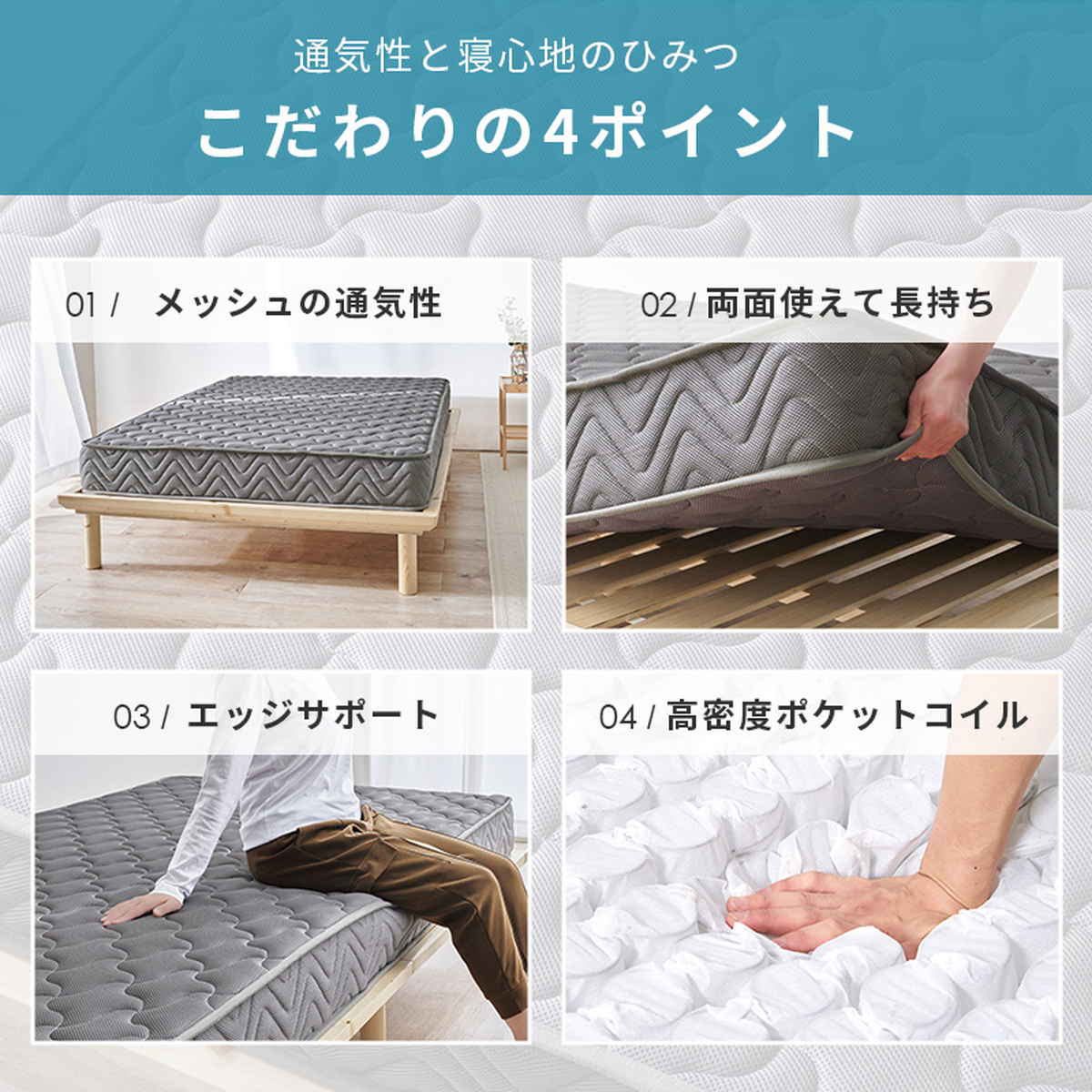 表裏どちらの面でも同じ寝心地で使える両面仕様なので、裏表の入れ替えに加え、ヘッド側・フット側の向きを入れ替えることで、合計4パターンのローテーションが可能です。負荷が一点に集中しにくく、マットレスの寿命を伸ばしながら、長く快適にお使いいただけます。
