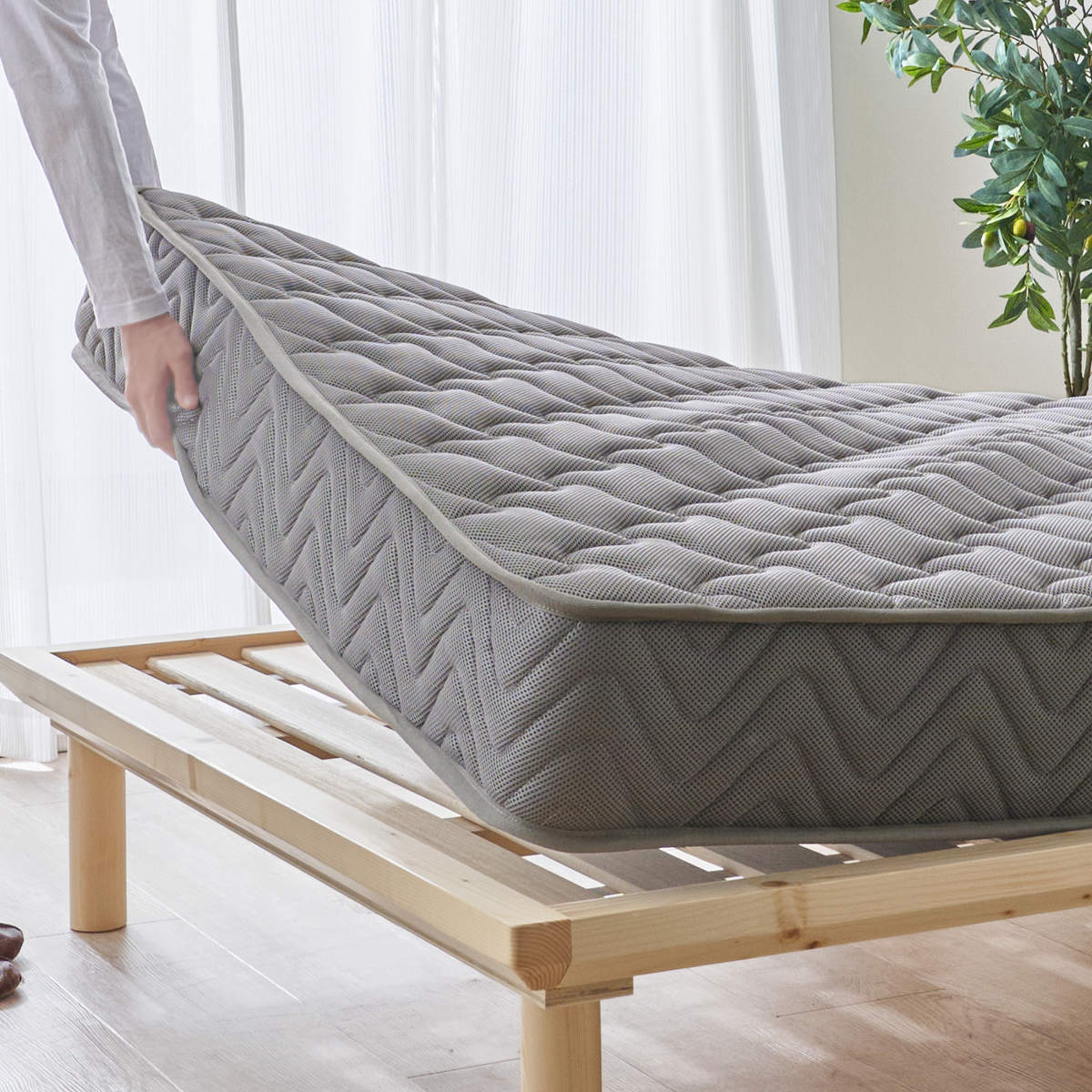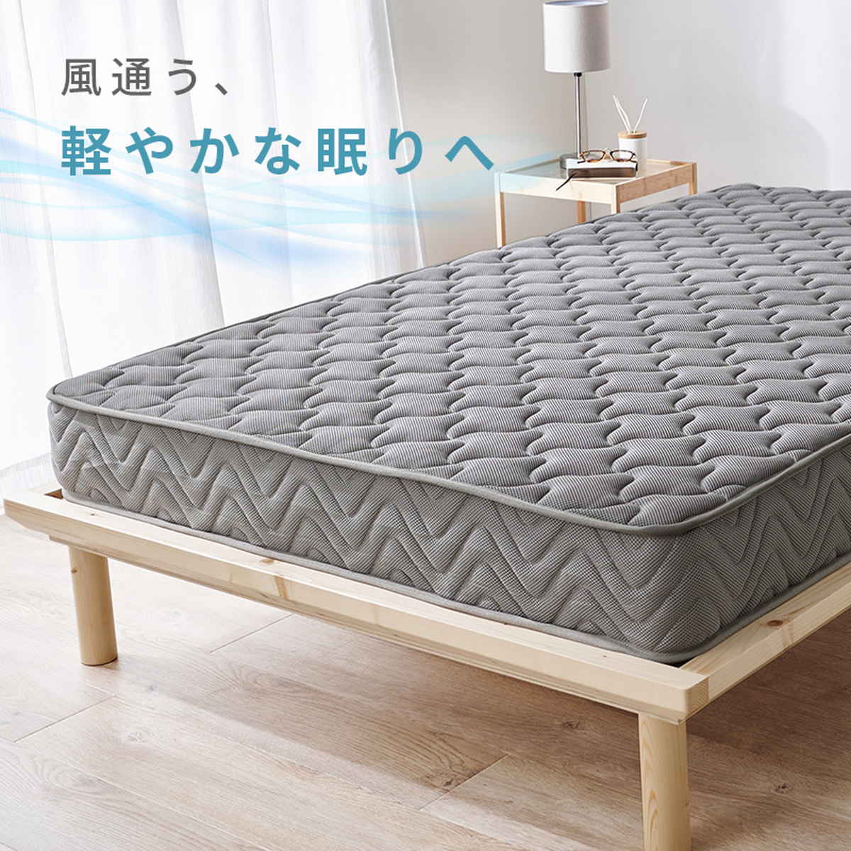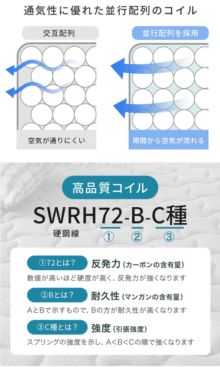 コイルは空気が通りやすい「並行配列」を採用し、内部の通気性をさらに向上させています。反発力・耐久性・強度に優れた高品質コイルを使用しており、長期間使ってもヘタリにくく、安定した寝心地が続きます。