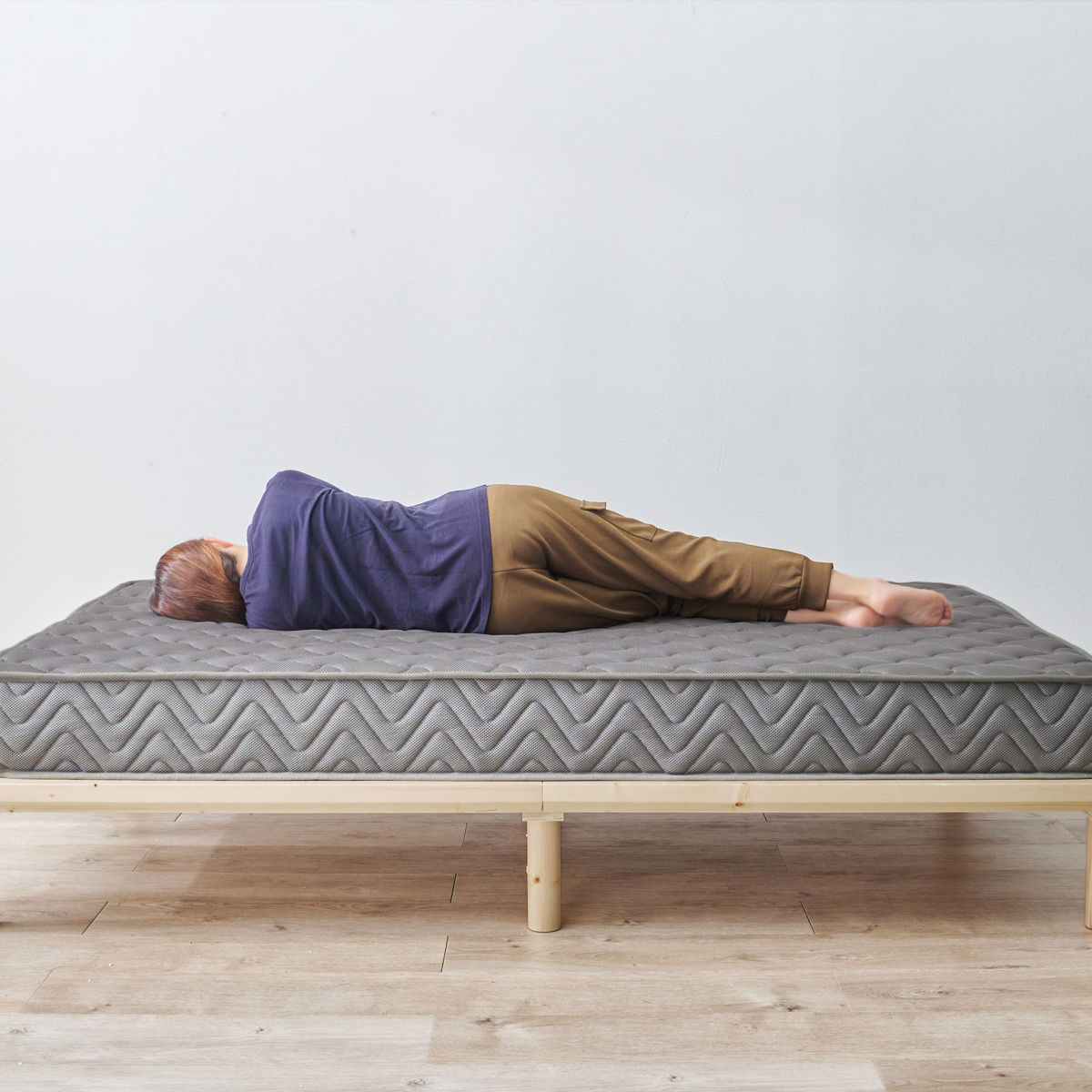 体を点で支えるポケットコイルを高密度に配置しています。背中・腰・肩など、重さのかかる部分に合わせて自然に沈み込み、体圧を分散します。横向きでも仰向けでも体にフィットし、バランスの良い寝姿勢を保ちやすい寝心地です。