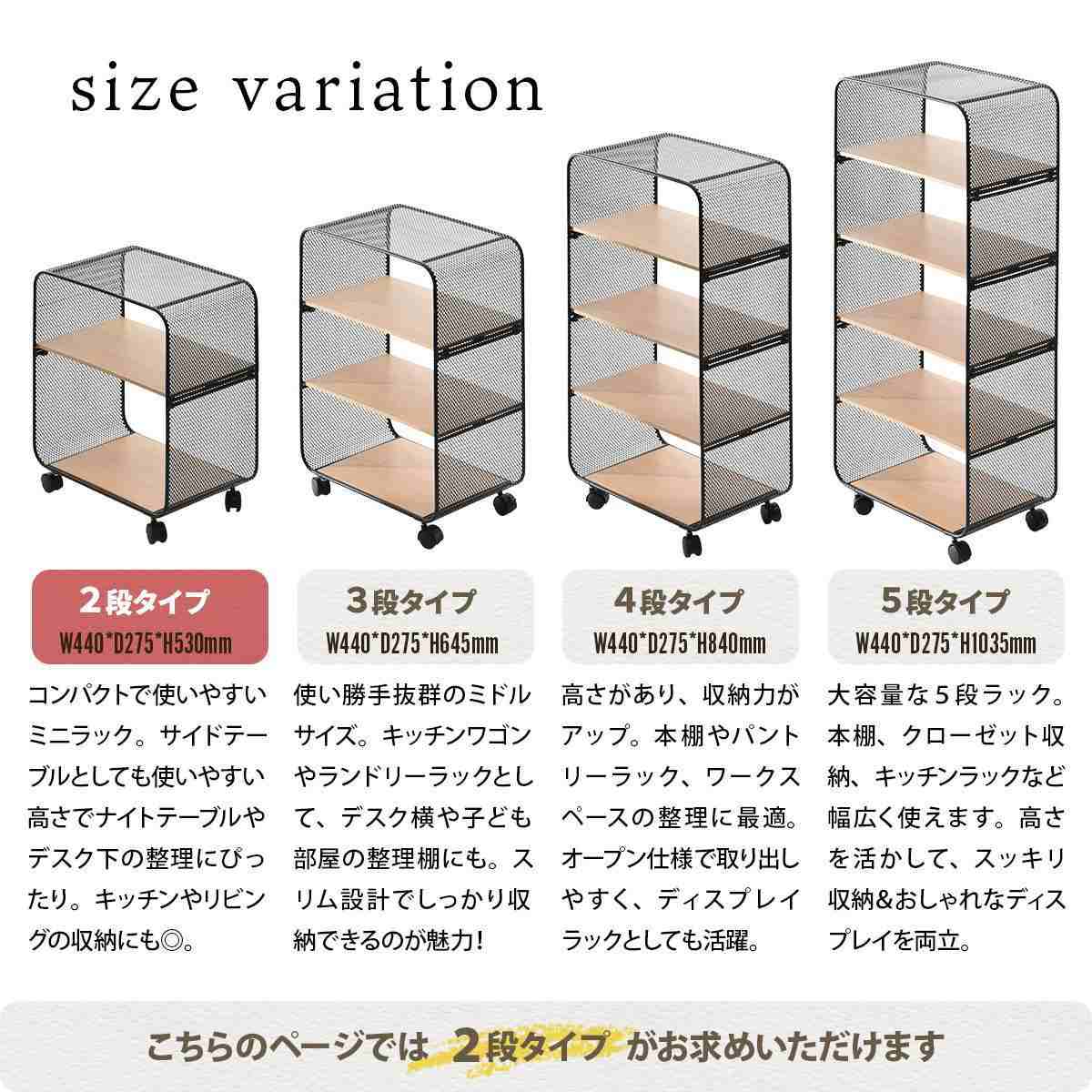 4種類のサイズ展開で、用途に合わせてぴったりのタイプを選ぶことができます。コンパクトな2段はナイトテーブルや玄関収納、3段はキッチンワゴンやデスク横の収納に。4段・5段は、本棚やオープンクローゼットとして収納力を求める方におすすめです。