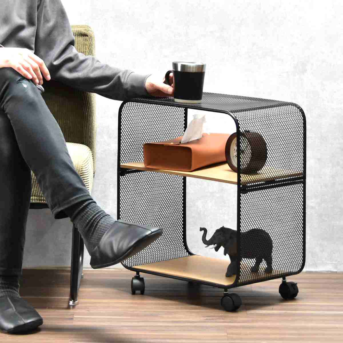オープンラック 幅44cm 2段 木目調 キャスター付き 収納棚 シェルフ ( ラック 棚 本棚 飾り棚 ワゴン 収納 ディスプレイ 省スペース コンパクト ブラックスチール パンチング加工 ブラック 黒 )のレビュー
