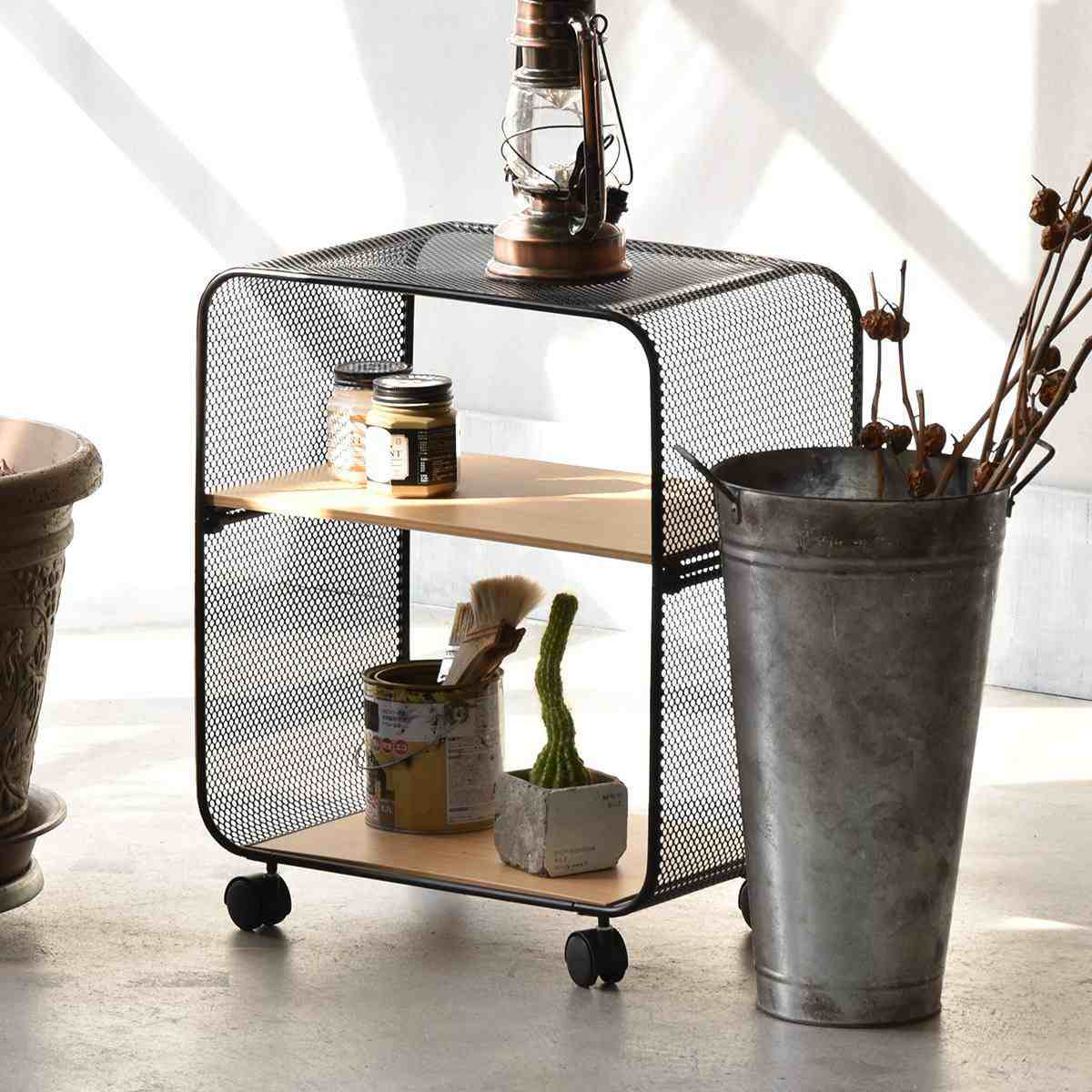オープンラック 幅44cm 2段 木目調 キャスター付き 収納棚 シェルフ ( ラック 棚 本棚 飾り棚 ワゴン 収納 ディスプレイ 省スペース コンパクト ブラックスチール パンチング加工 ブラック 黒 )