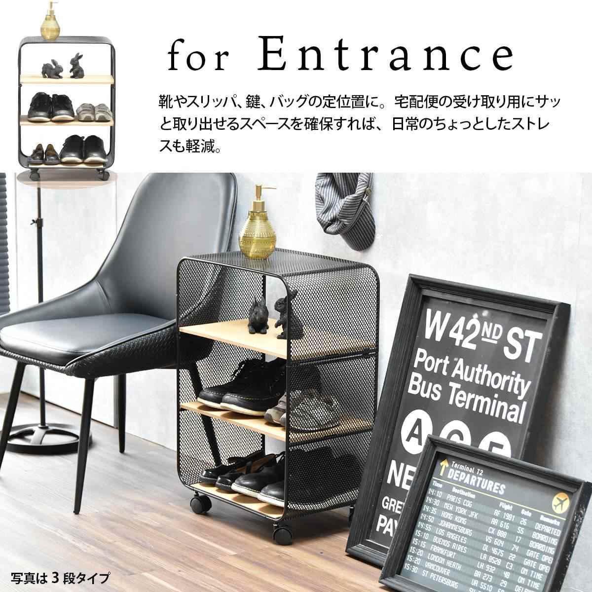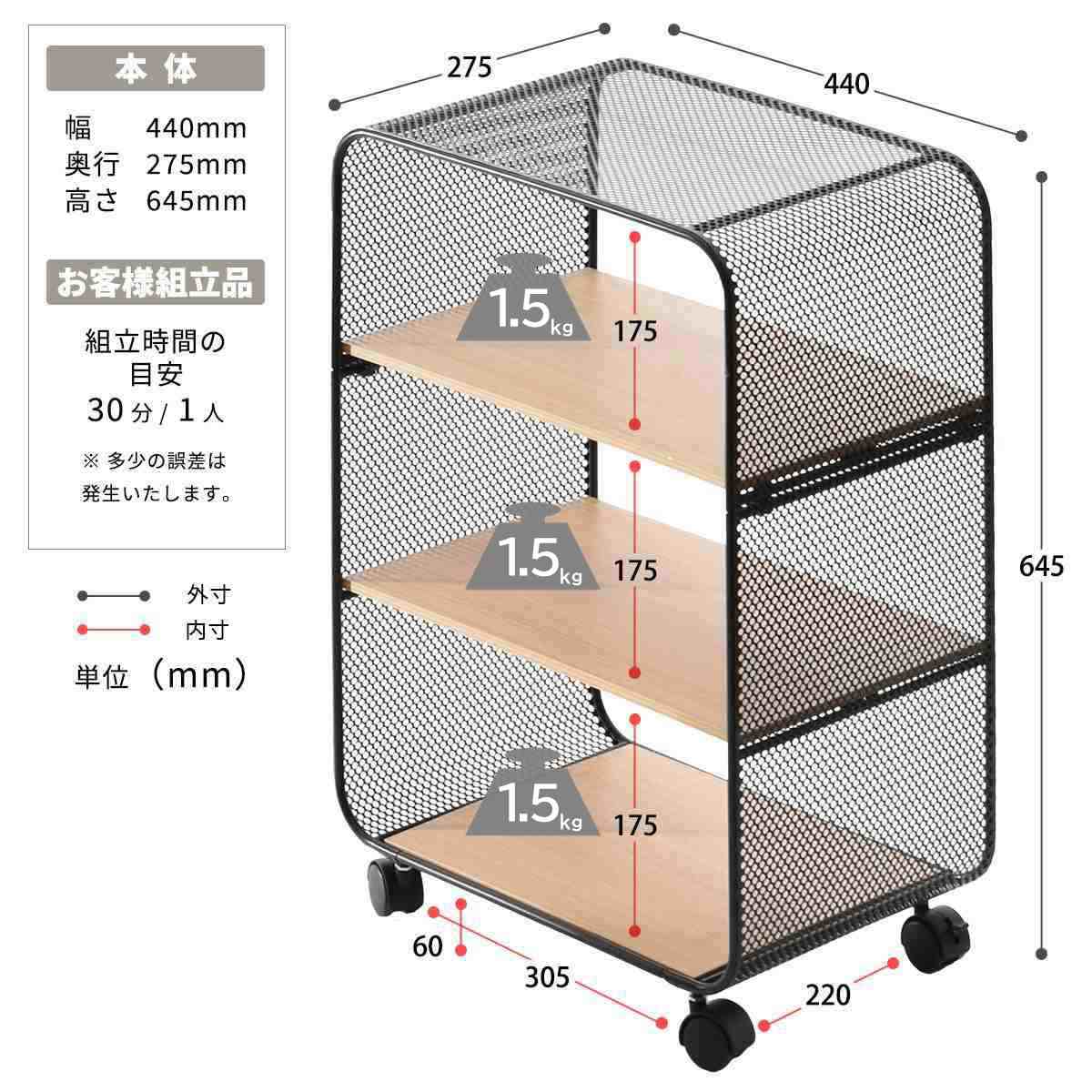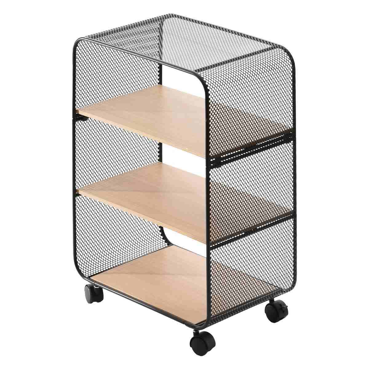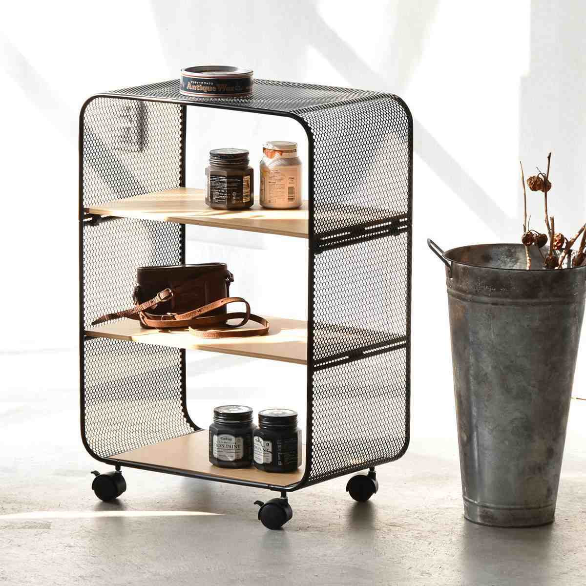 オープンラック 幅44cm 3段 木目調 キャスター付き 収納棚 シェルフ ( ラック 棚 本棚 飾り棚 ワゴン 収納 ディスプレイ 省スペース コンパクト ブラックスチール パンチング加工 ブラック 黒 )