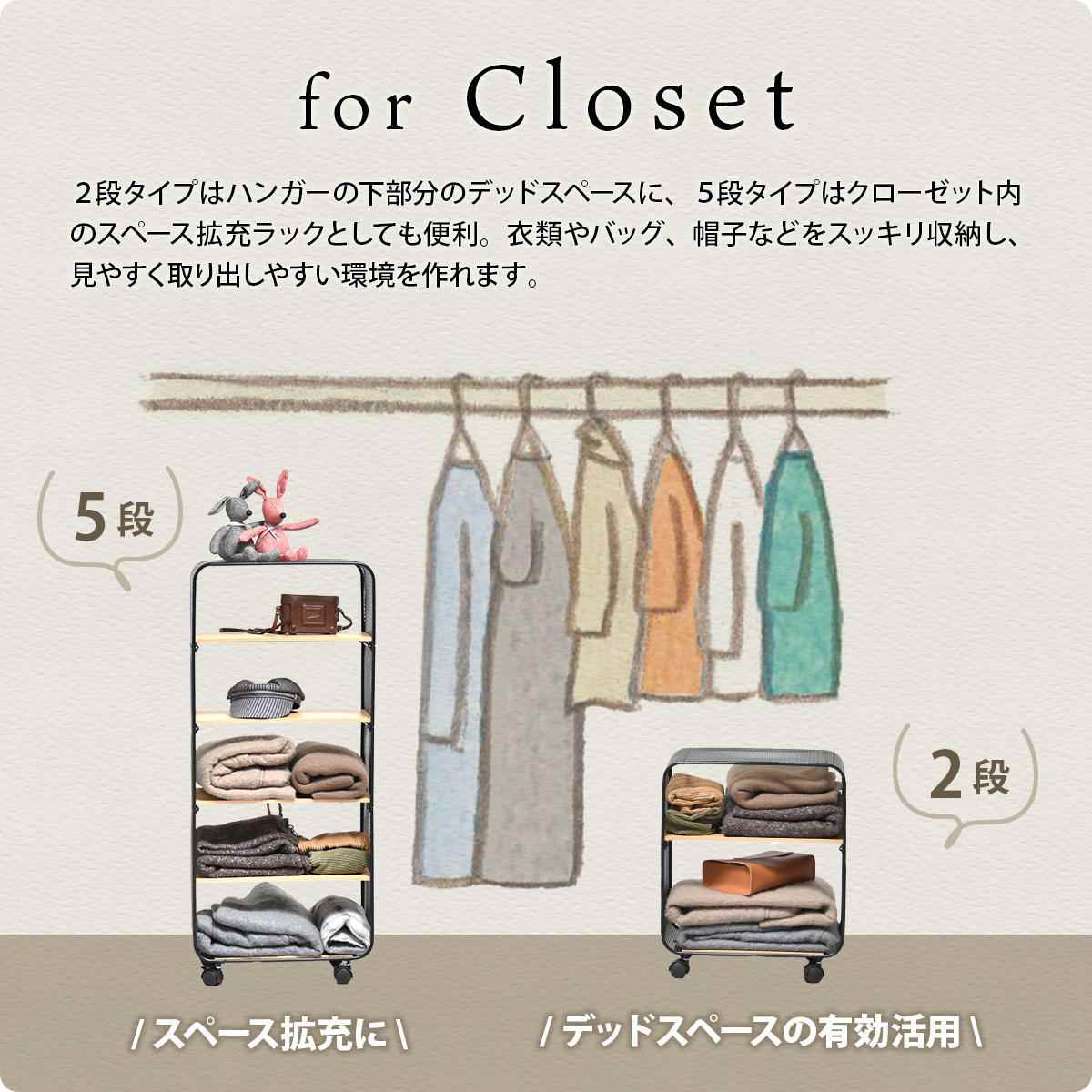 4種類のサイズ展開で、用途に合わせてぴったりのタイプを選ぶことができます。コンパクトな2段はナイトテーブルや玄関収納、3段はキッチンワゴンやデスク横の収納に。4段・5段は、本棚やオープンクローゼットとして収納力を求める方におすすめです。