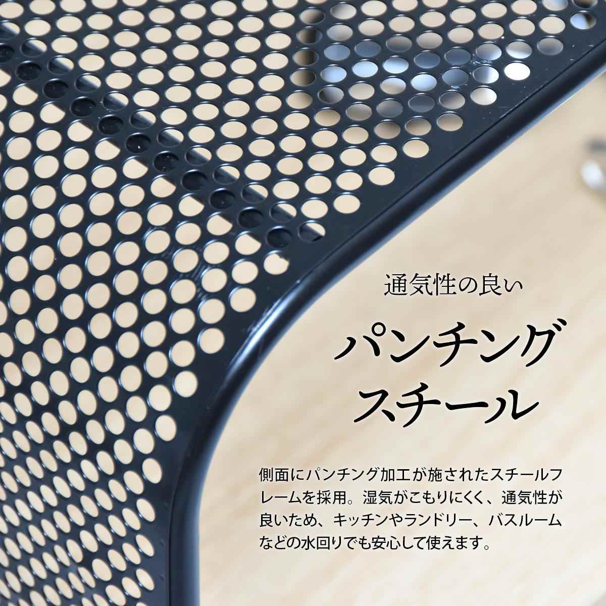 フレームは、パンチング加工が施されたスチールを採用。湿気がこもりにくく通気性が良いため、キッチンやランドリー、バスルームなどの水回りでも安心してお使いいただけます。