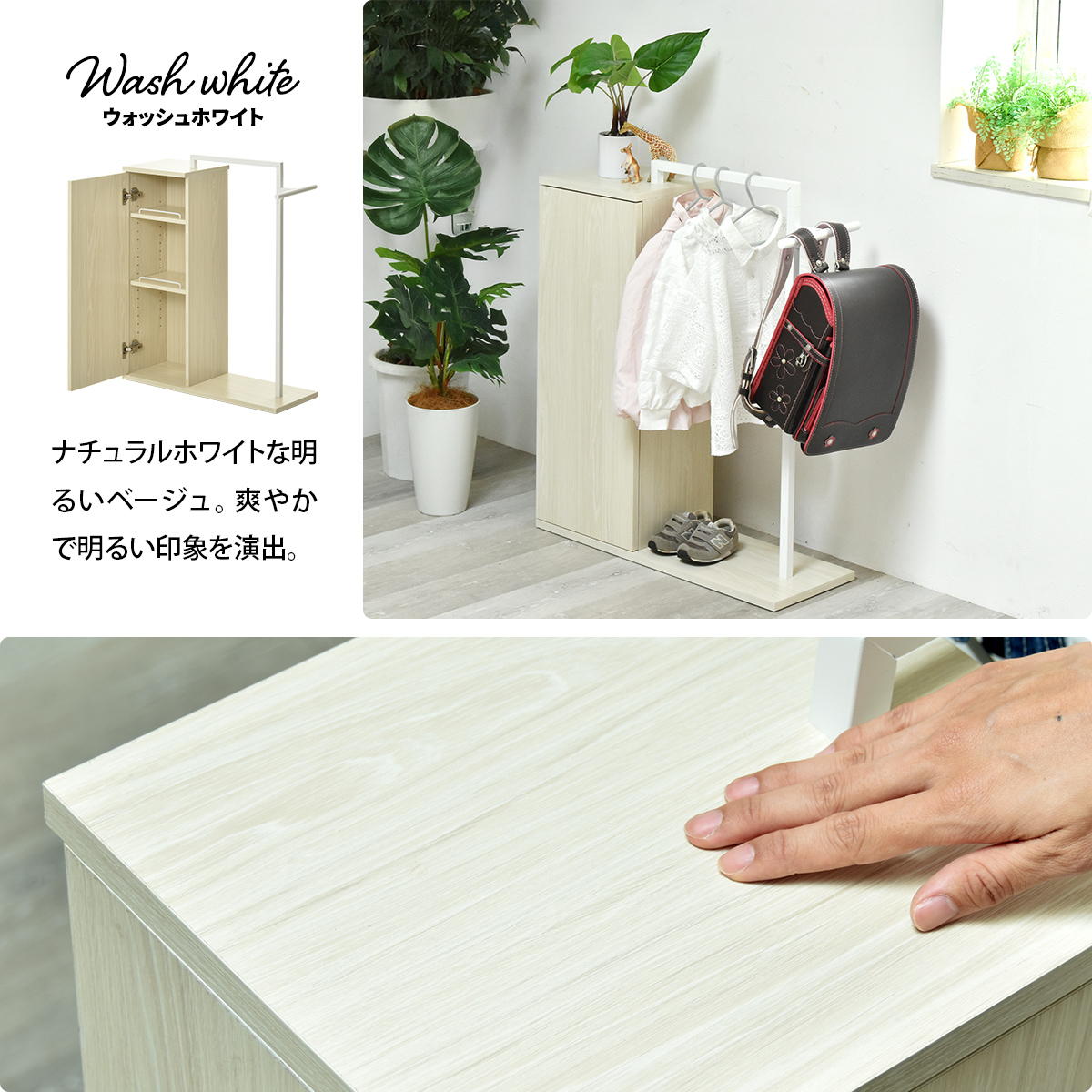 | 材質 | 天板・棚板・側板・底板:中質繊維板にメラミン貼り ハンガーフレーム:スチールパイプ(粉体塗装) |