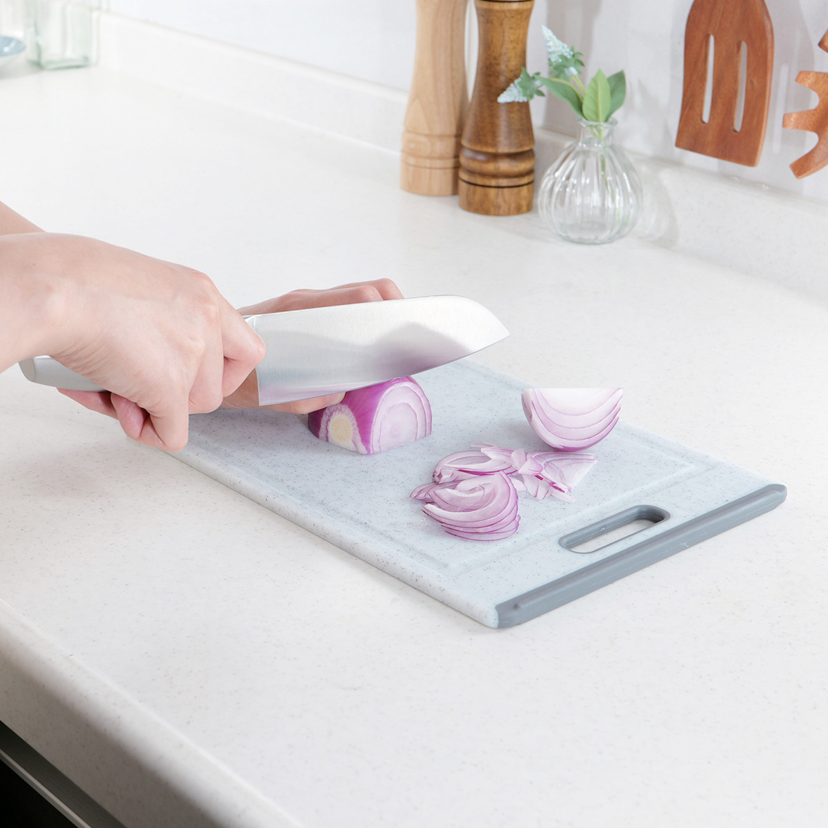 フチには溝を設けており、食材から出る水分をしっかりキャッチ。さらに滑り止め付きで作業中も安定感があり安心です。