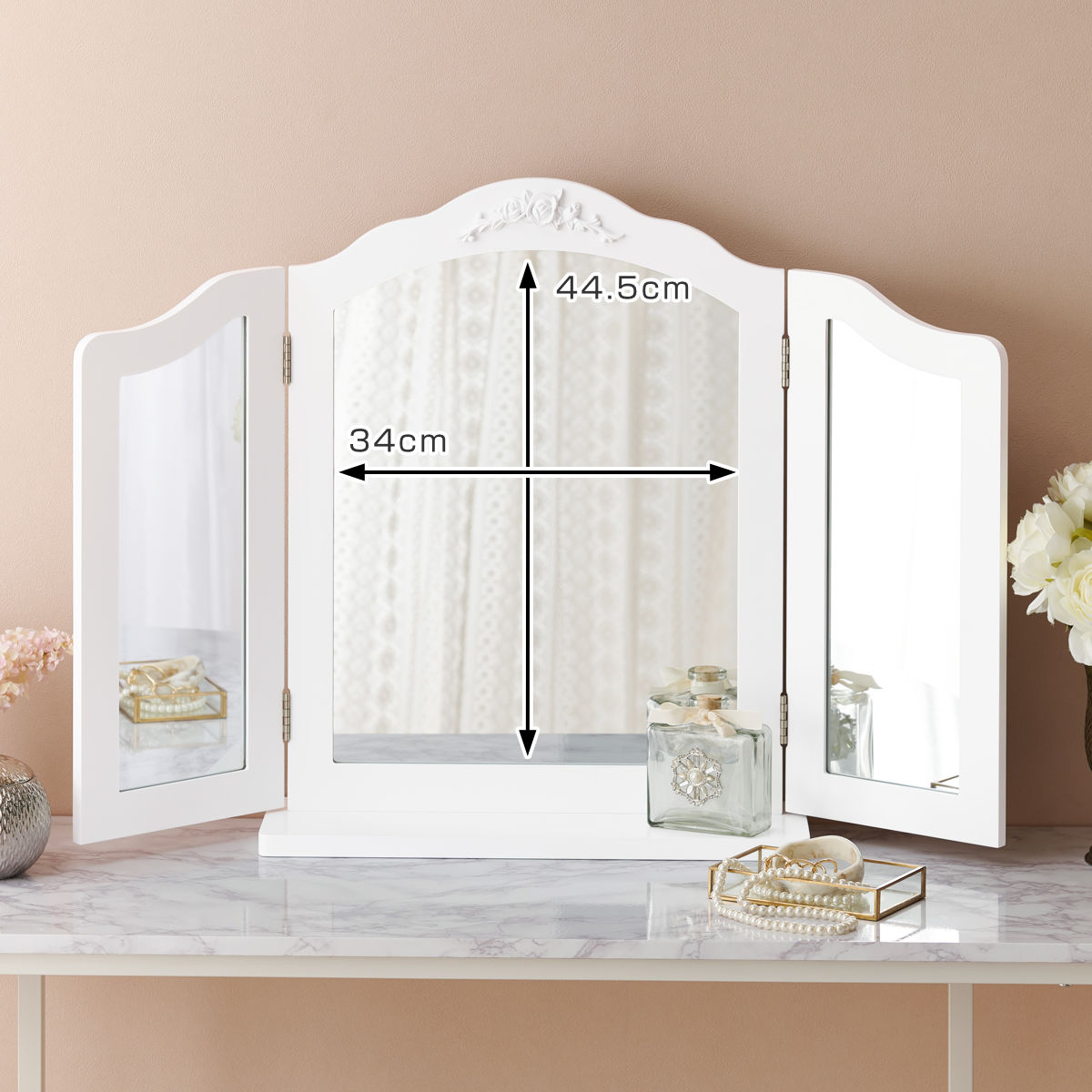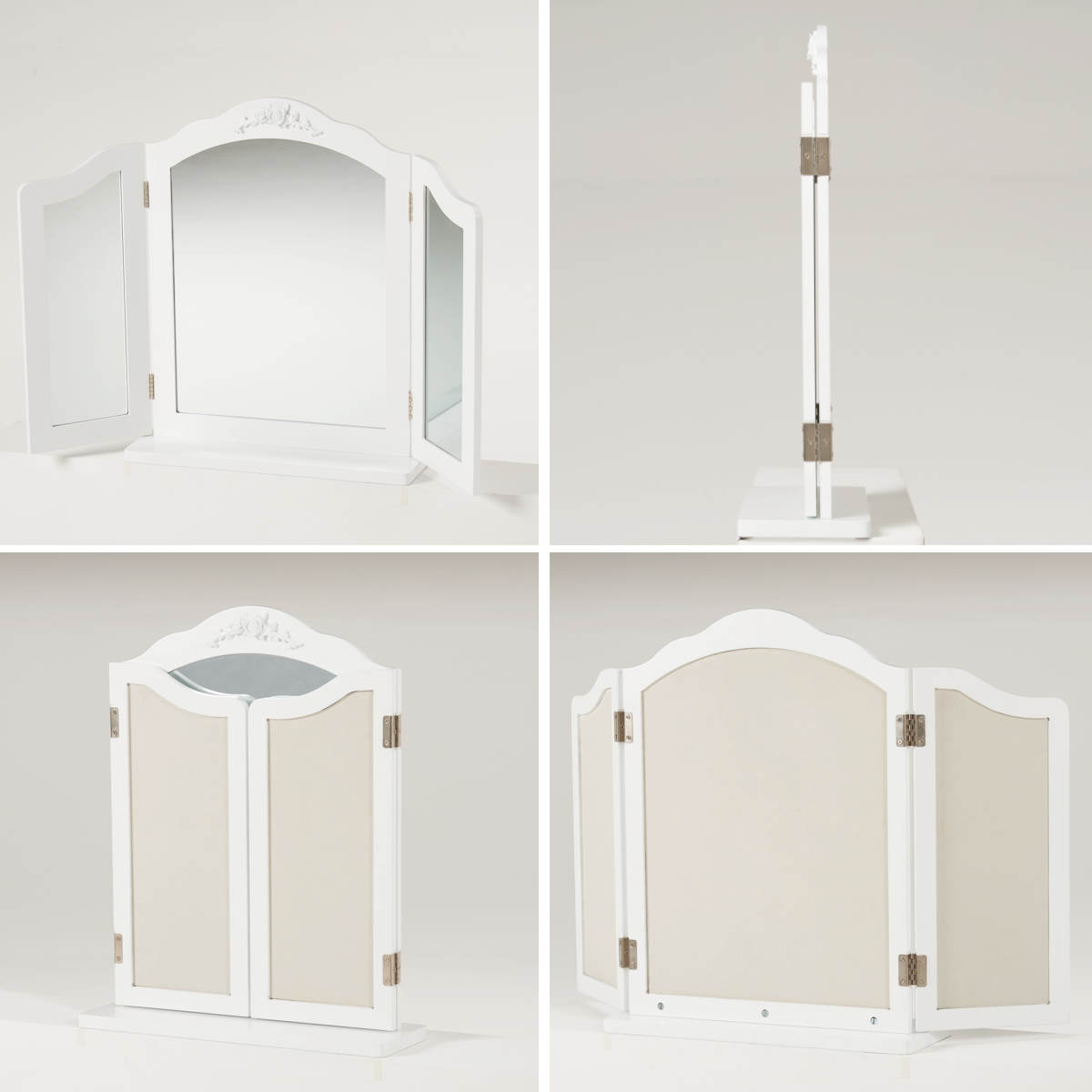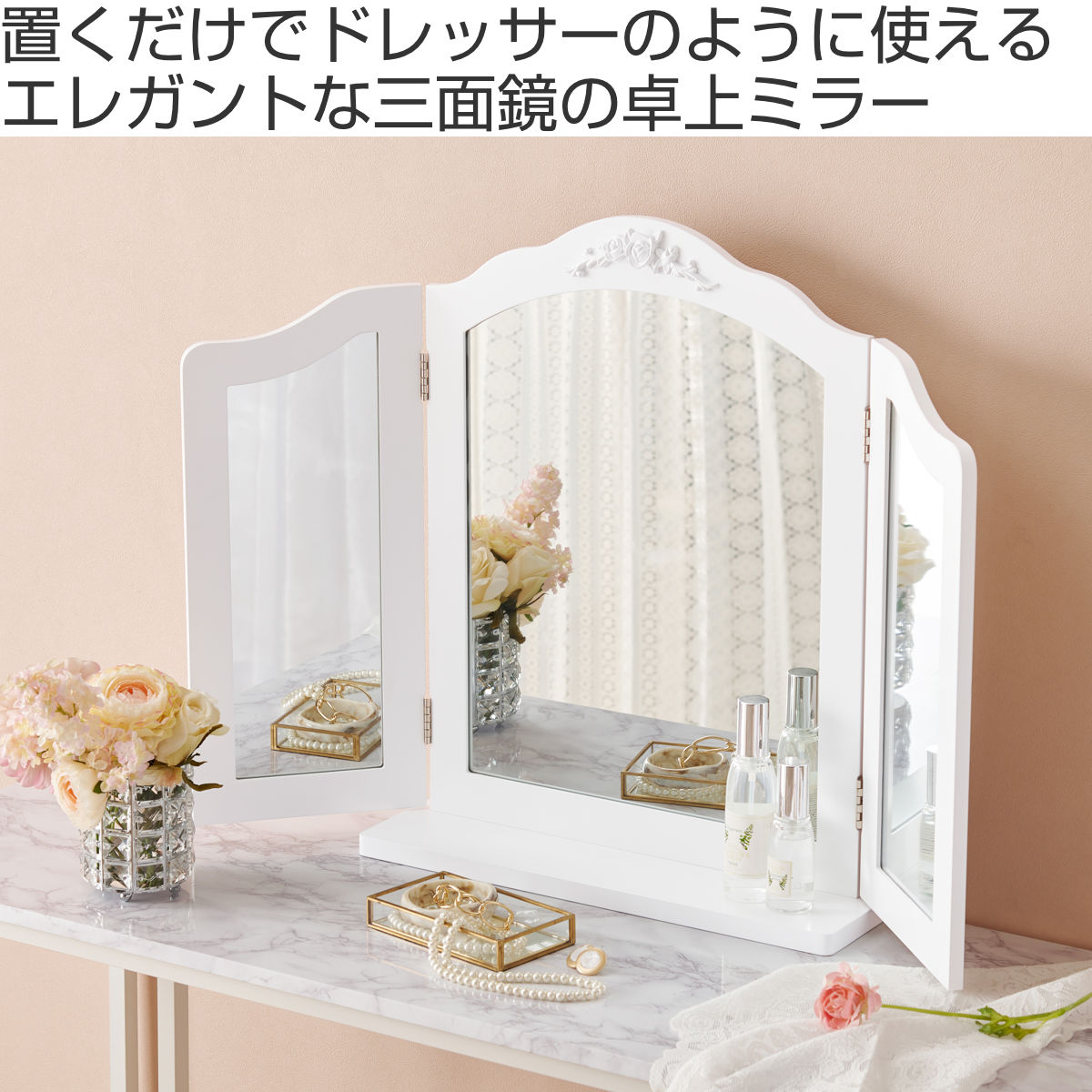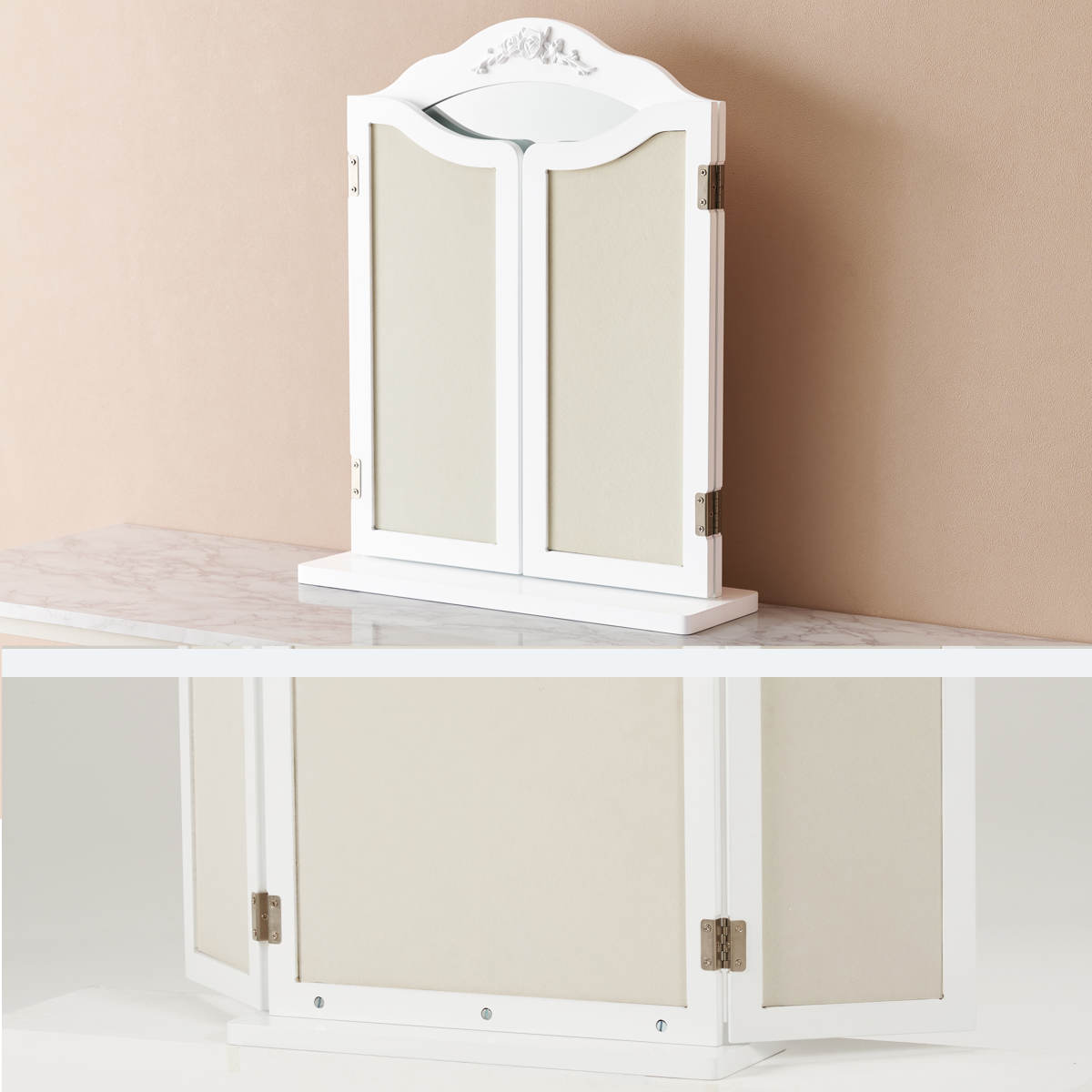 卓上ミラー 三面鏡 おしゃれ 大きめ ( 鏡 ミラー エレガント 白 姫系 ドレッサー 大型 卓上鏡 ホワイトインテリア 滑り止め付 ヘアメイク 大きめサイズ )