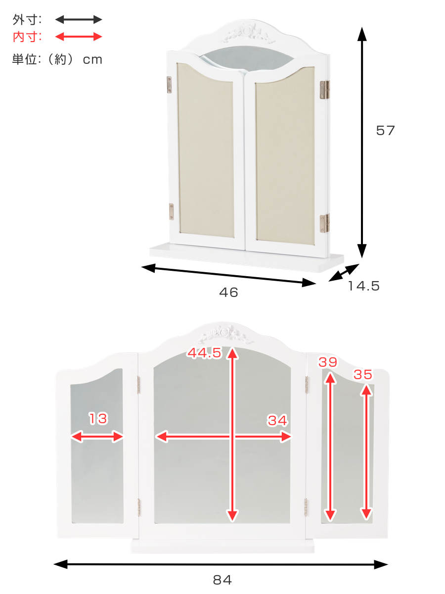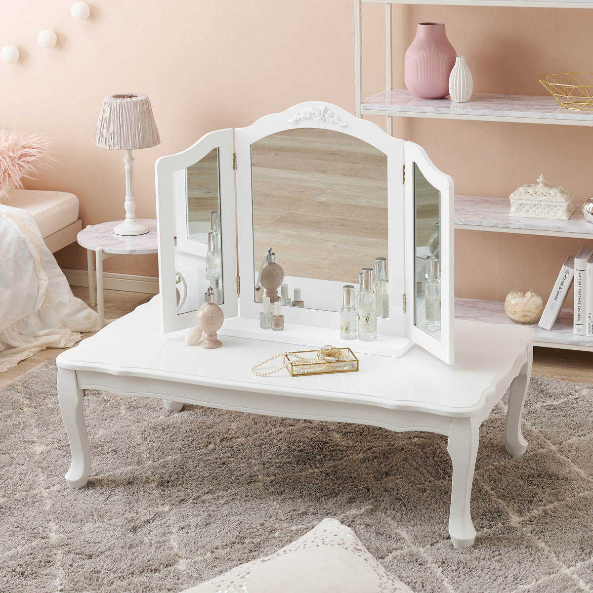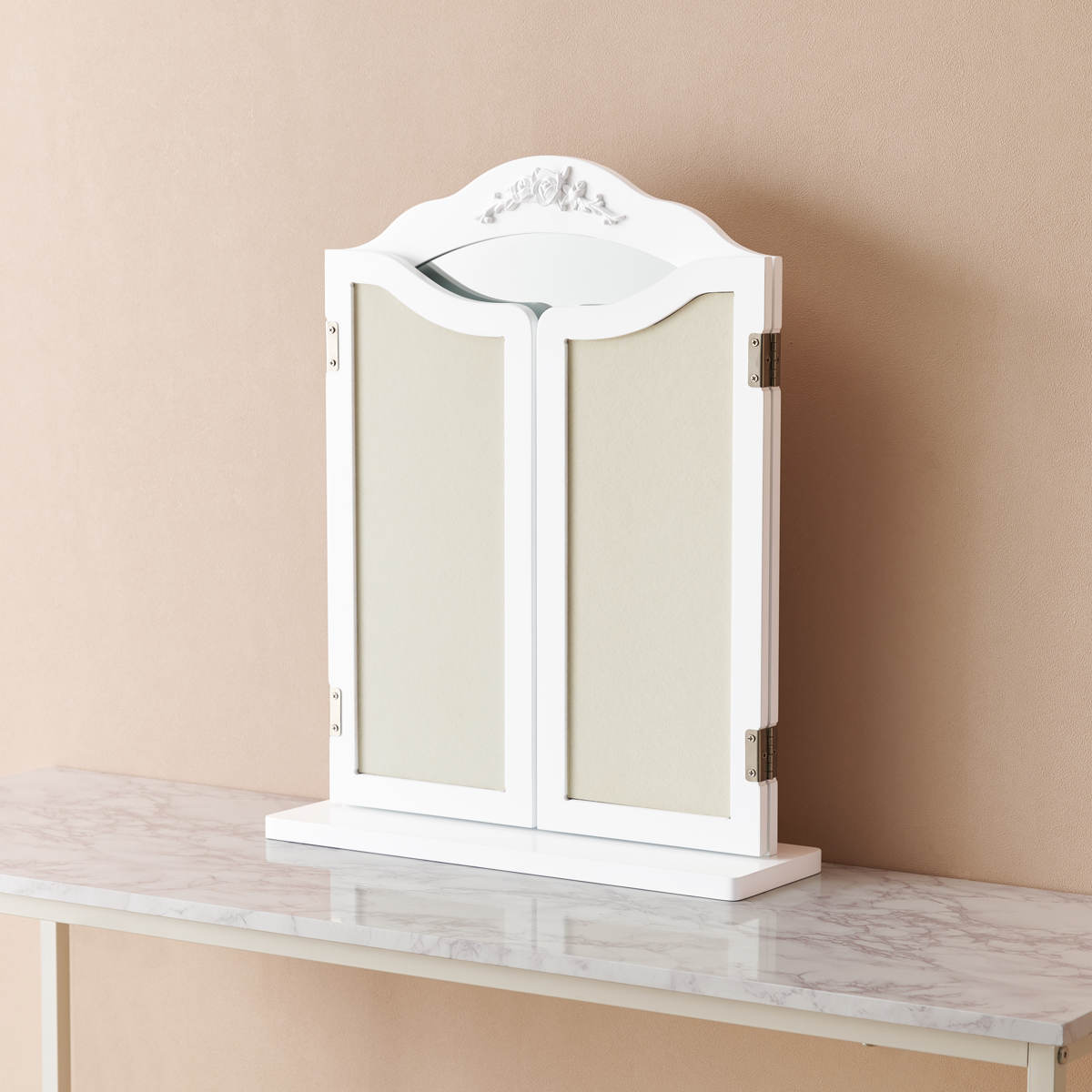 卓上ミラー 三面鏡 おしゃれ 大きめ ( 鏡 ミラー エレガント 白 姫系 ドレッサー 大型 卓上鏡 ホワイトインテリア 滑り止め付 ヘアメイク 大きめサイズ )