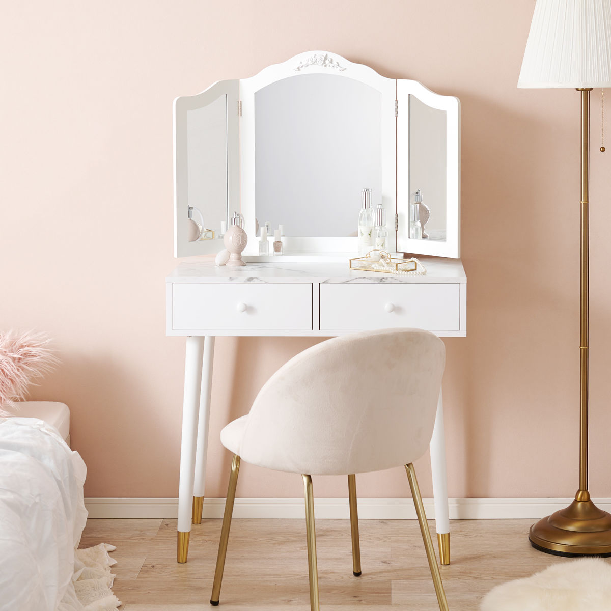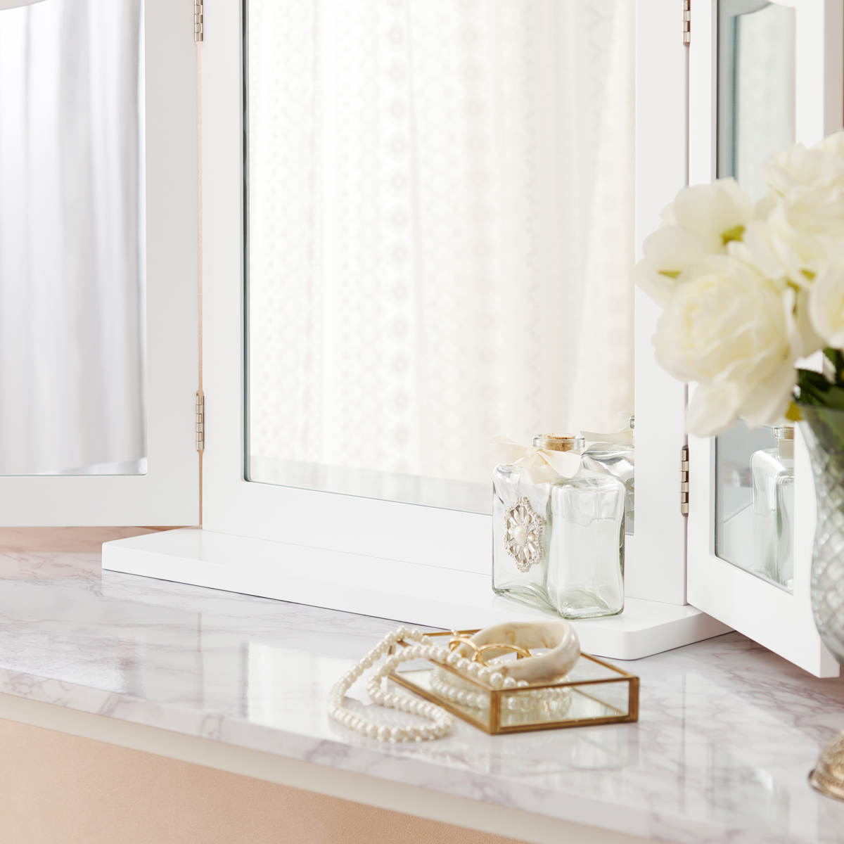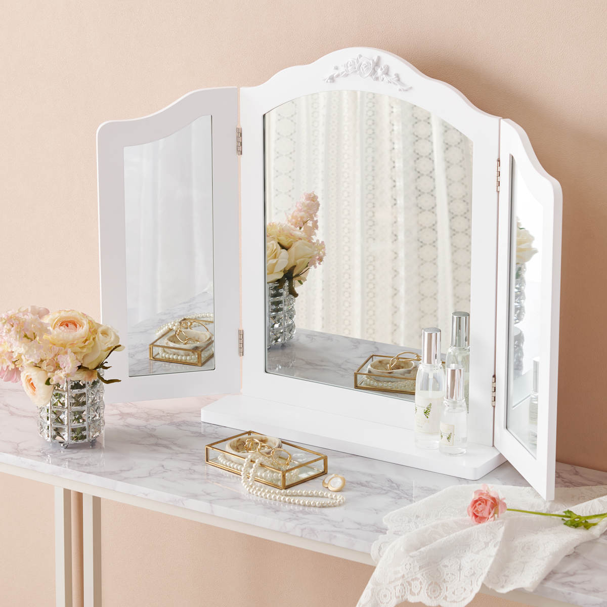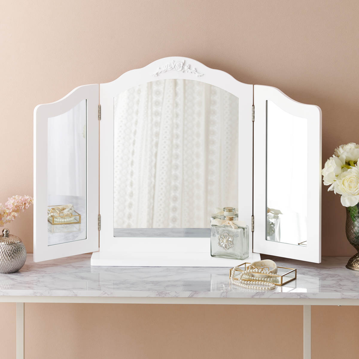 卓上ミラー 三面鏡 おしゃれ 大きめ ( 鏡 ミラー エレガント 白 姫系 ドレッサー 大型 卓上鏡 ホワイトインテリア 滑り止め付 ヘアメイク 大きめサイズ )