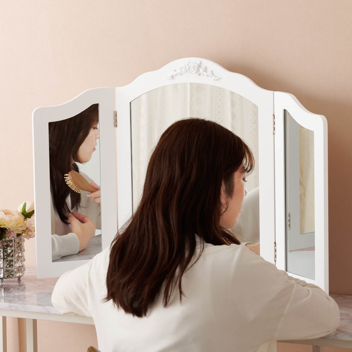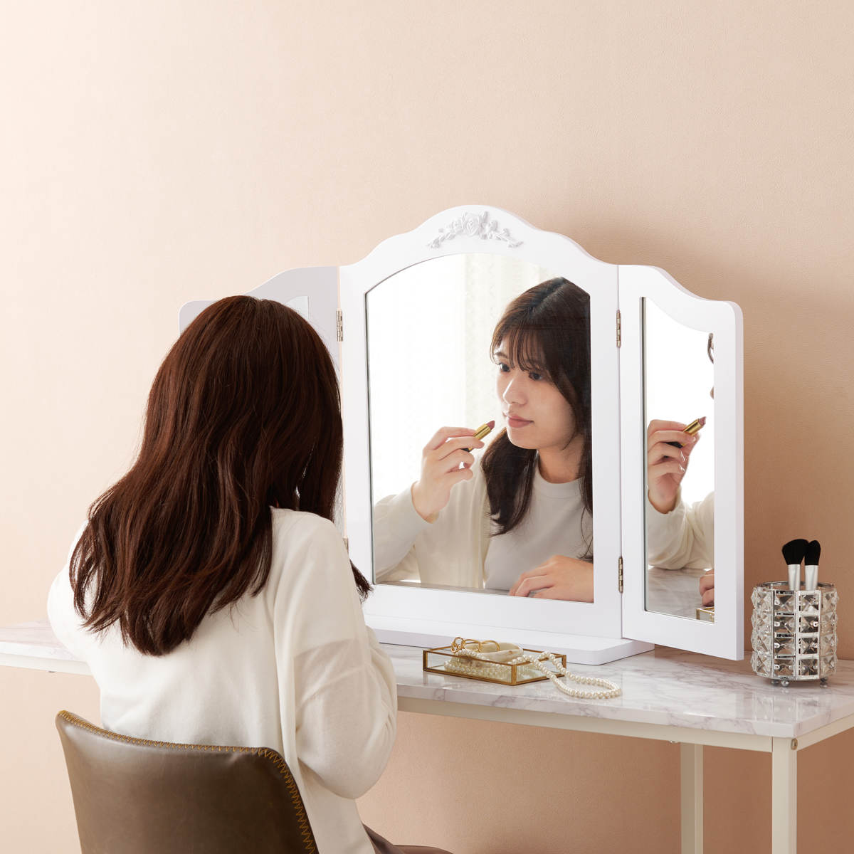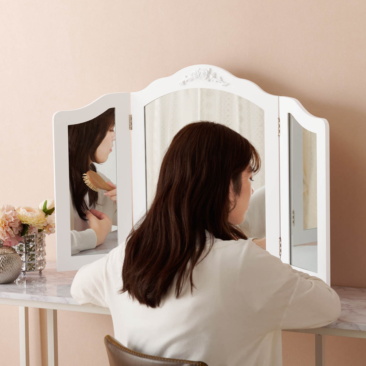 正面だけでなく左右からも確認できる三面鏡仕様。横顔や細部まで見やすく、メイクもヘアセットもワンランク上の完成度に。