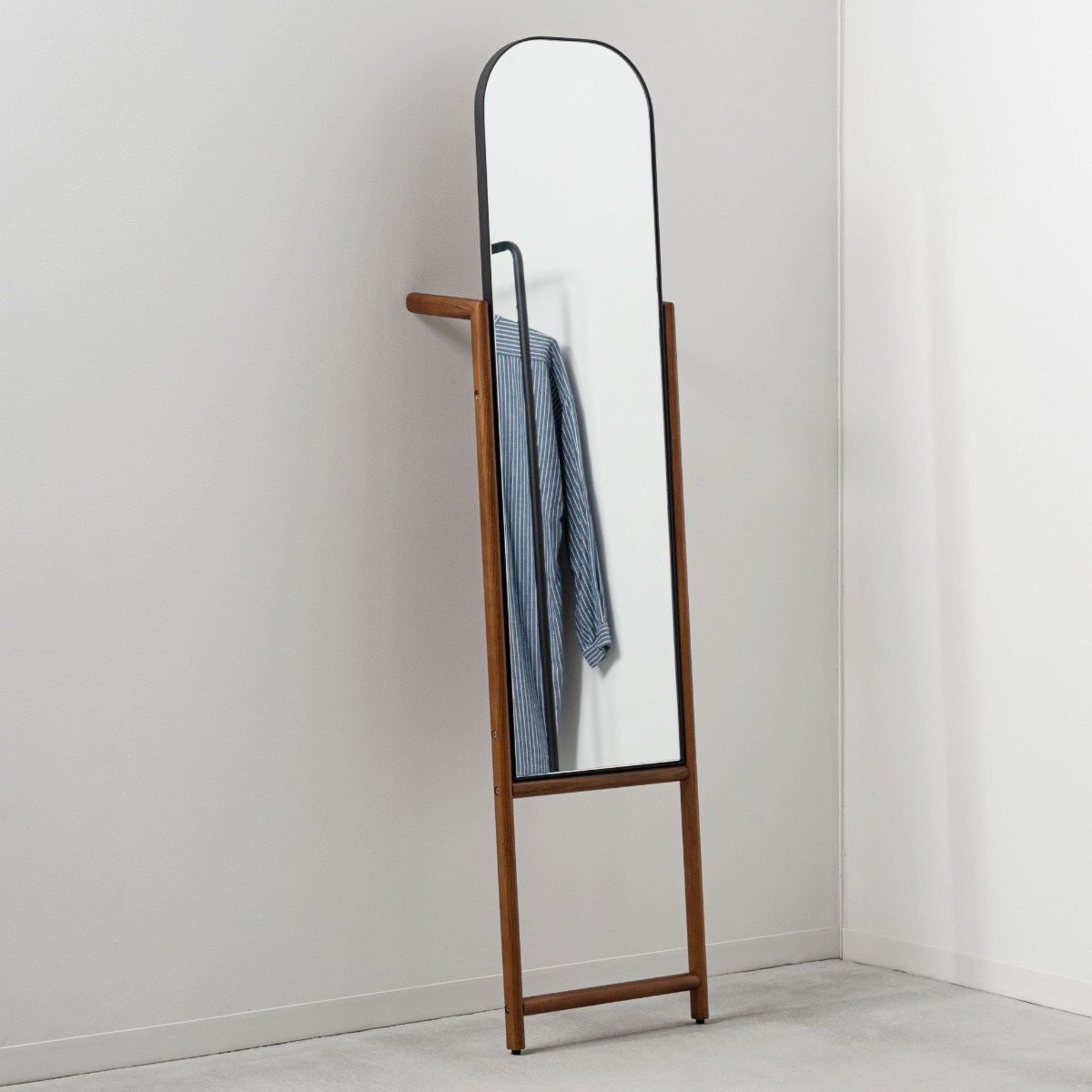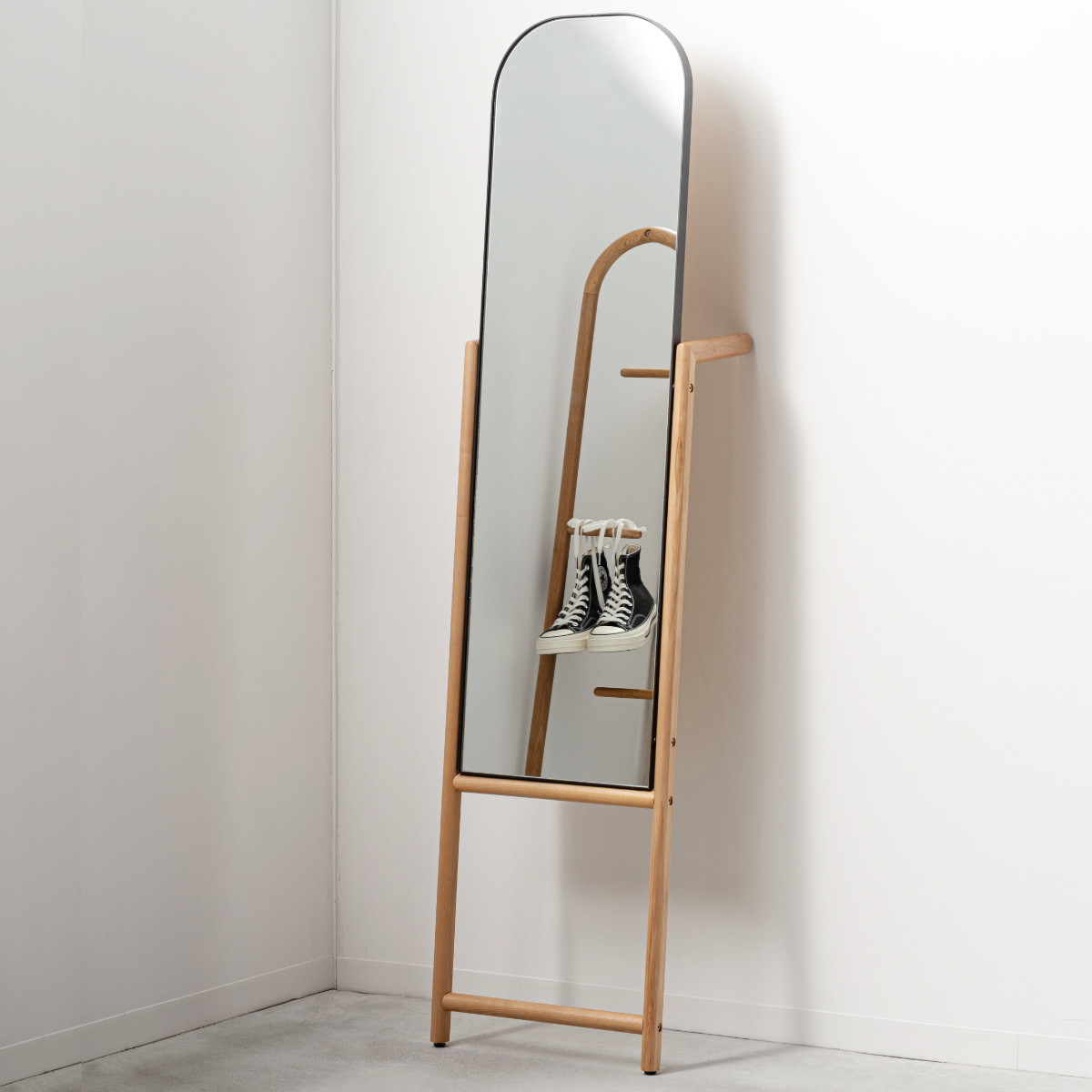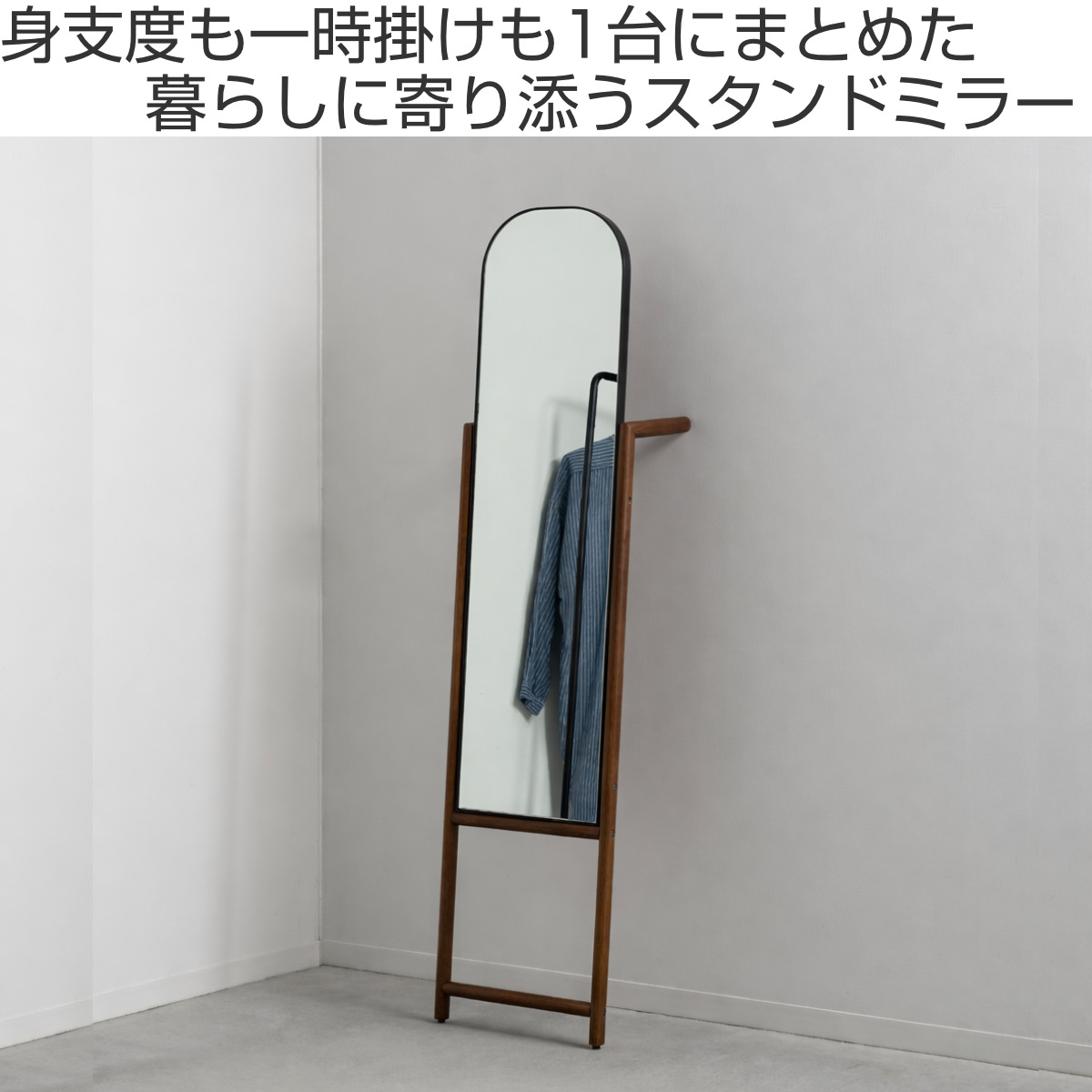 立て掛け部分にはハンガーなどを掛けられる仕様を取り入れ、身支度をサポートする実用的なデザインに。服やバッグを手元にまとめられるため、外出前の準備がスムーズに行えます。