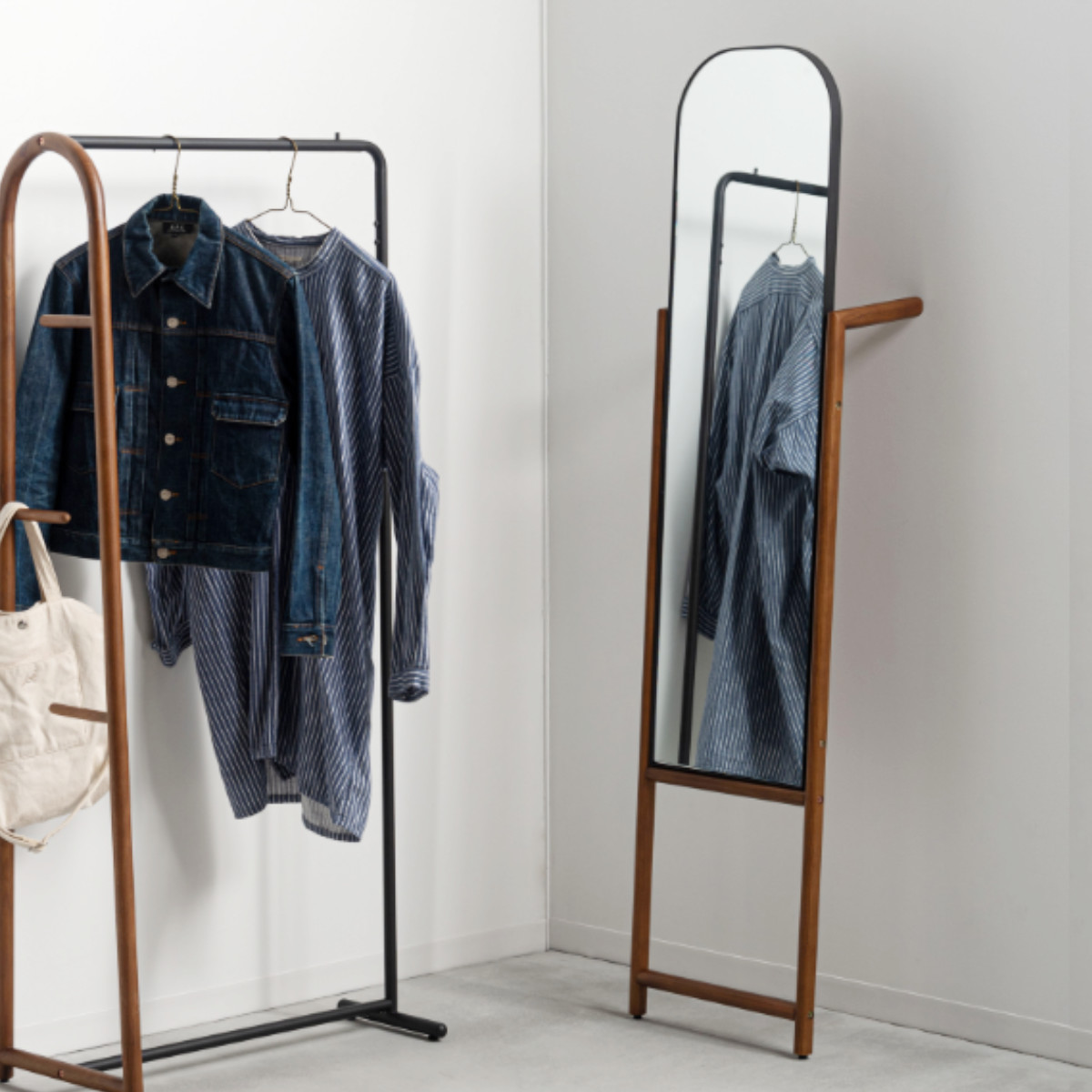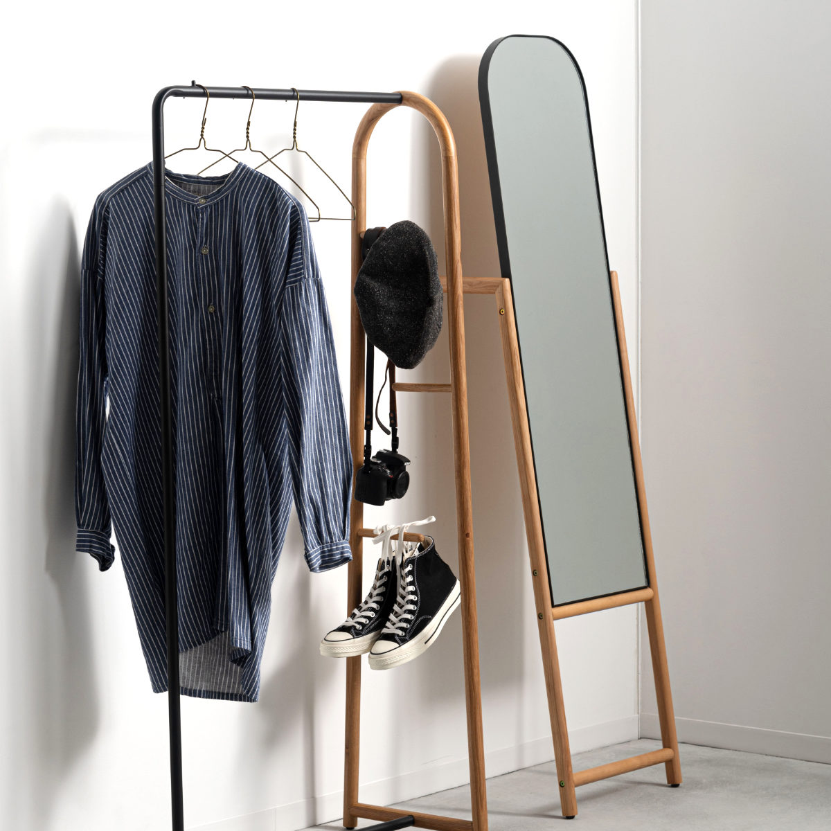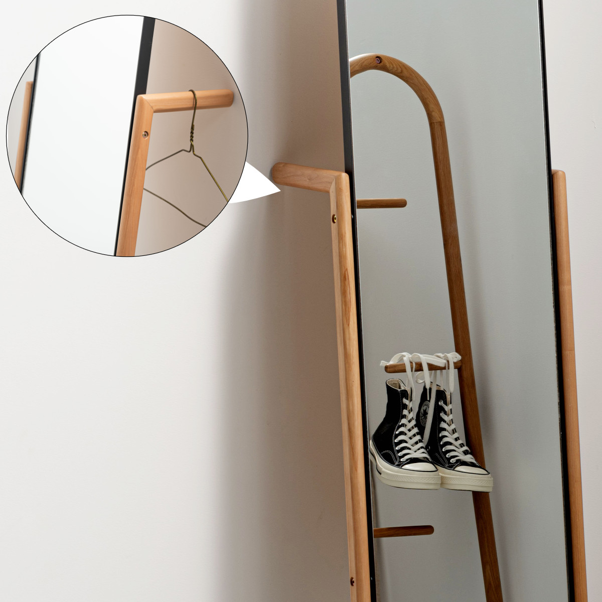 立て掛け部分にはハンガーなどを掛けられる仕様を取り入れ、身支度をサポートする実用的なデザインに。服やバッグを手元にまとめられるため、外出前の準備がスムーズに行えます。