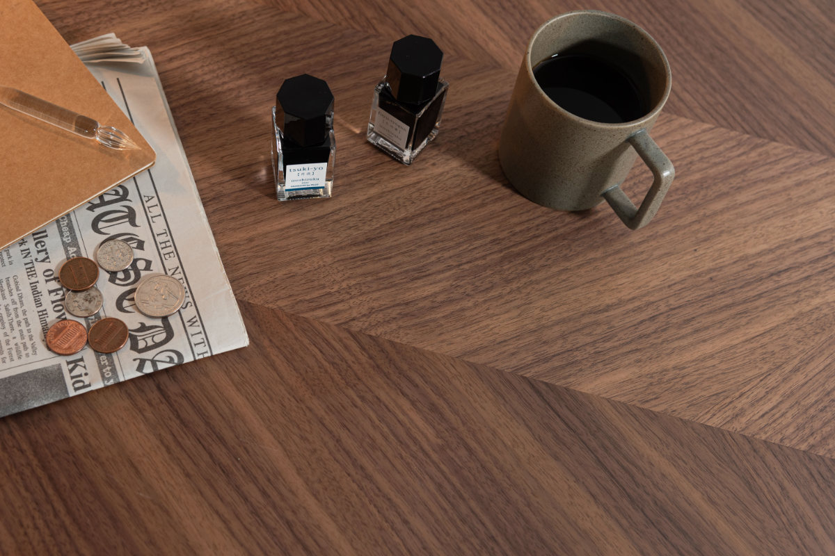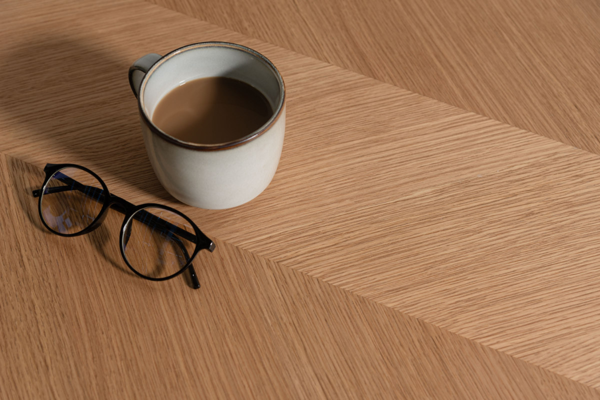 天然木化粧繊維板を使用した天板は、木目の向きを変えて貼り合わせた矢張りデザインが特徴です。木目の表情に奥行きが生まれ、空間に自然なアクセントを添えます。シンプルながらも、インテリアに映える仕上がりです。