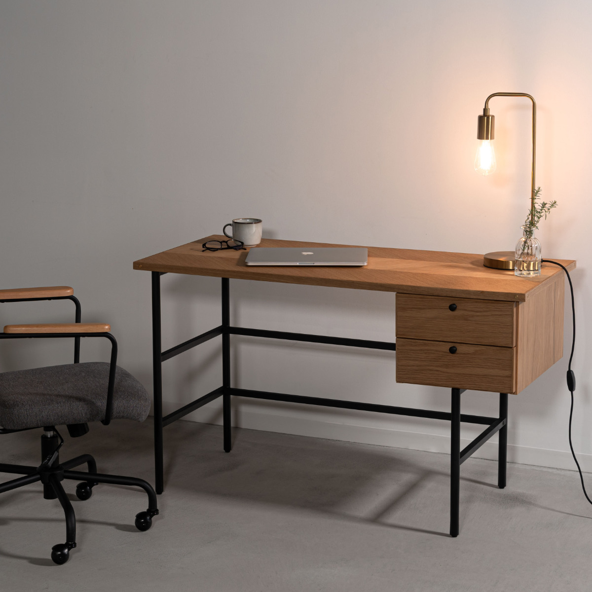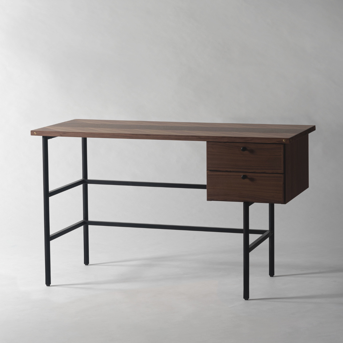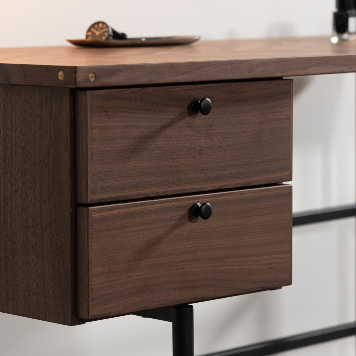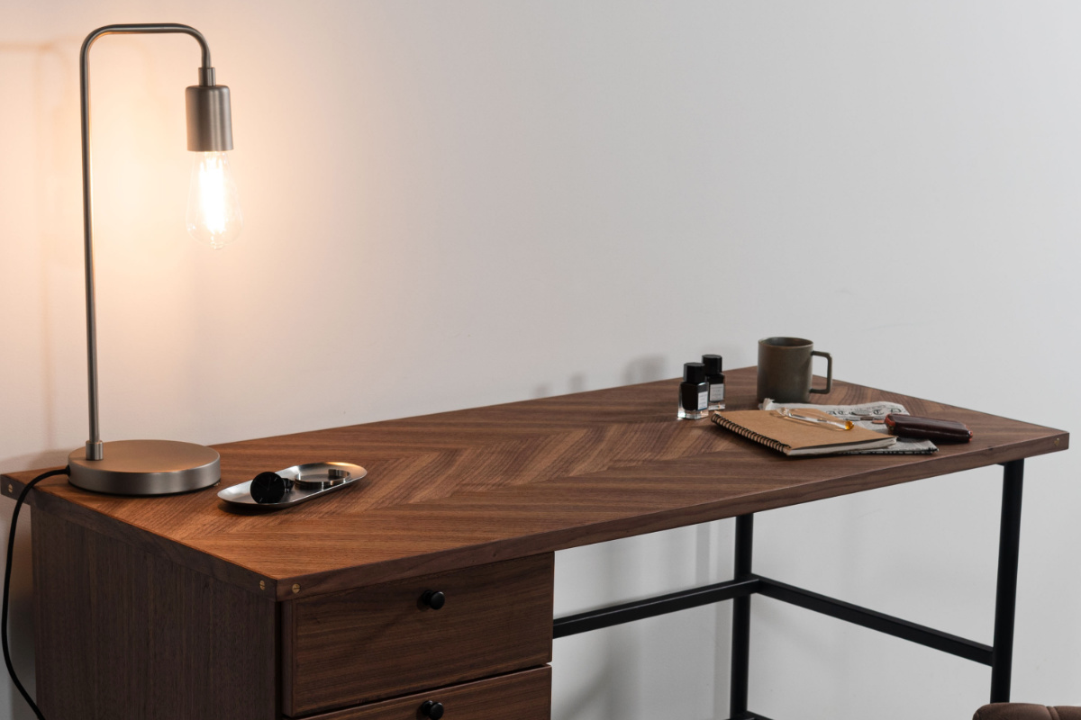 デスク側面にあしらった真鍮が、さりげなくおしゃれなアクセントに。シンプルなデザインの中にも、細部へのこだわりが感じられるパソコンデスクです。